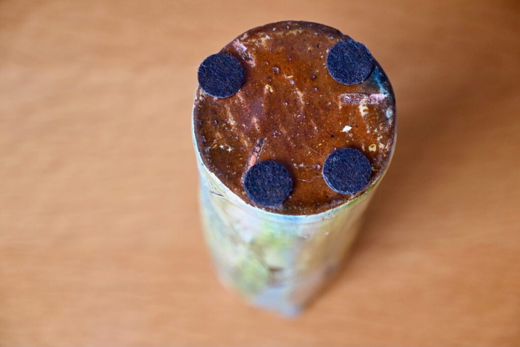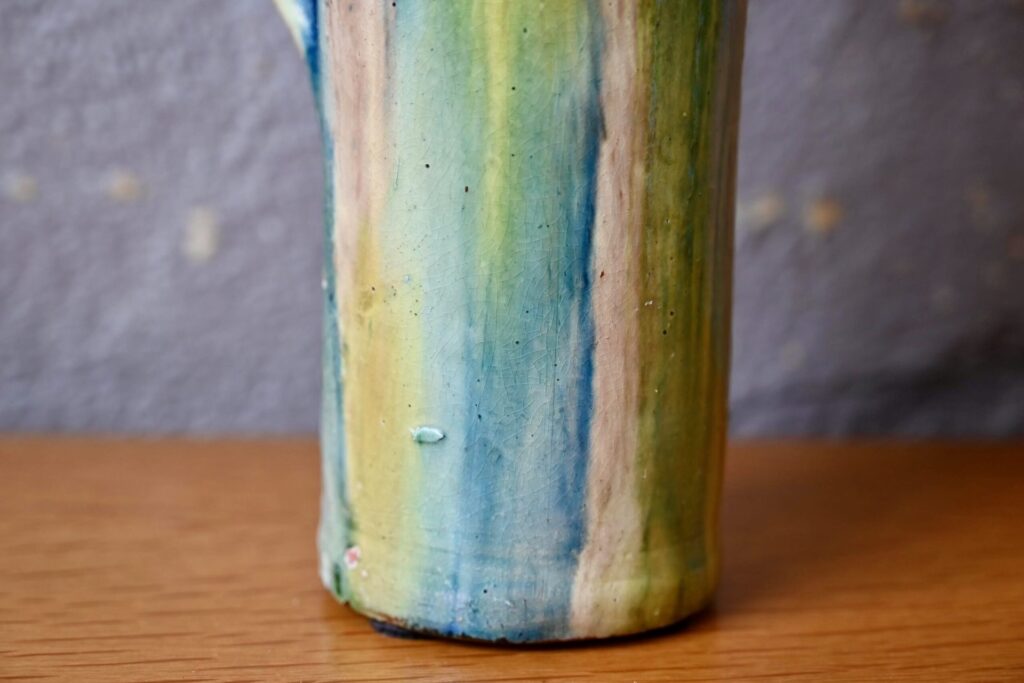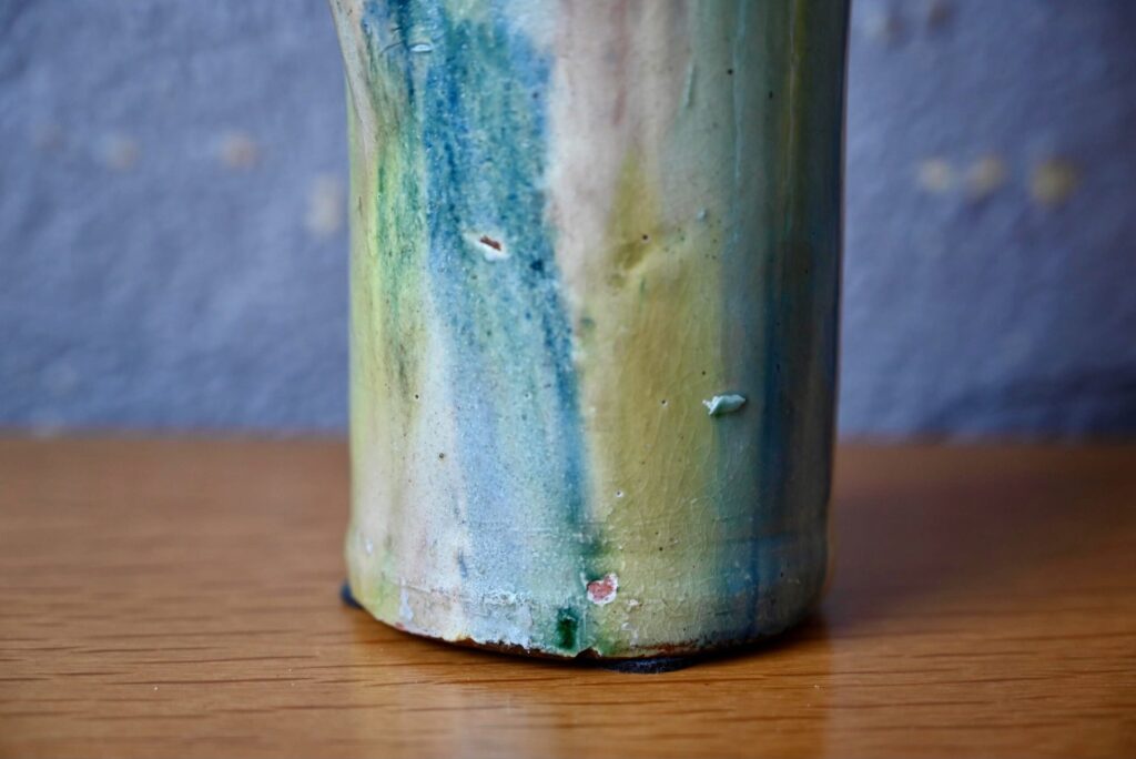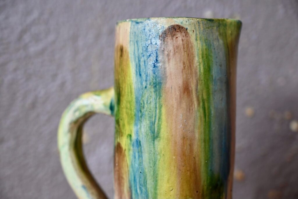 La cruche à eau est en terre cuite, en bel état. Un petit manque d’émail est à noter, visible en photo.