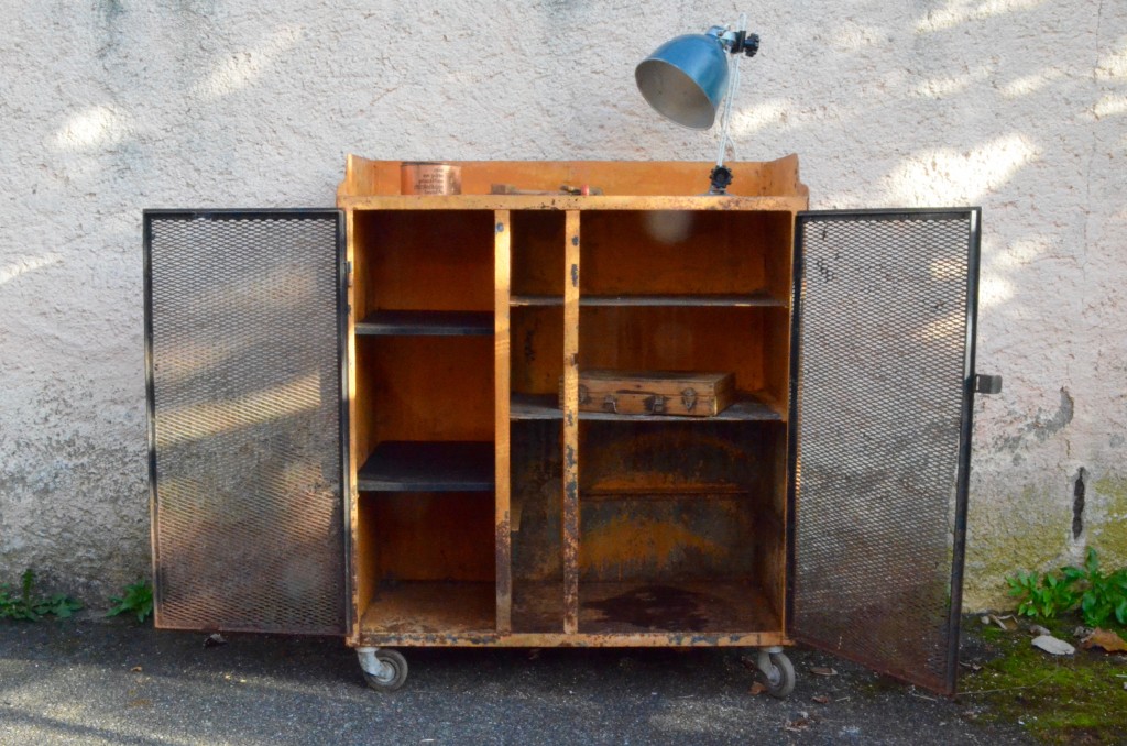 La desserte d’atelier est ancienne, elle est en métal. Ses portes sont grillagées. Sa peinture jaune orange est très patinée. L’ensemble est fonctionnel et solide. Nous avons remplacé les étagères intérieures.