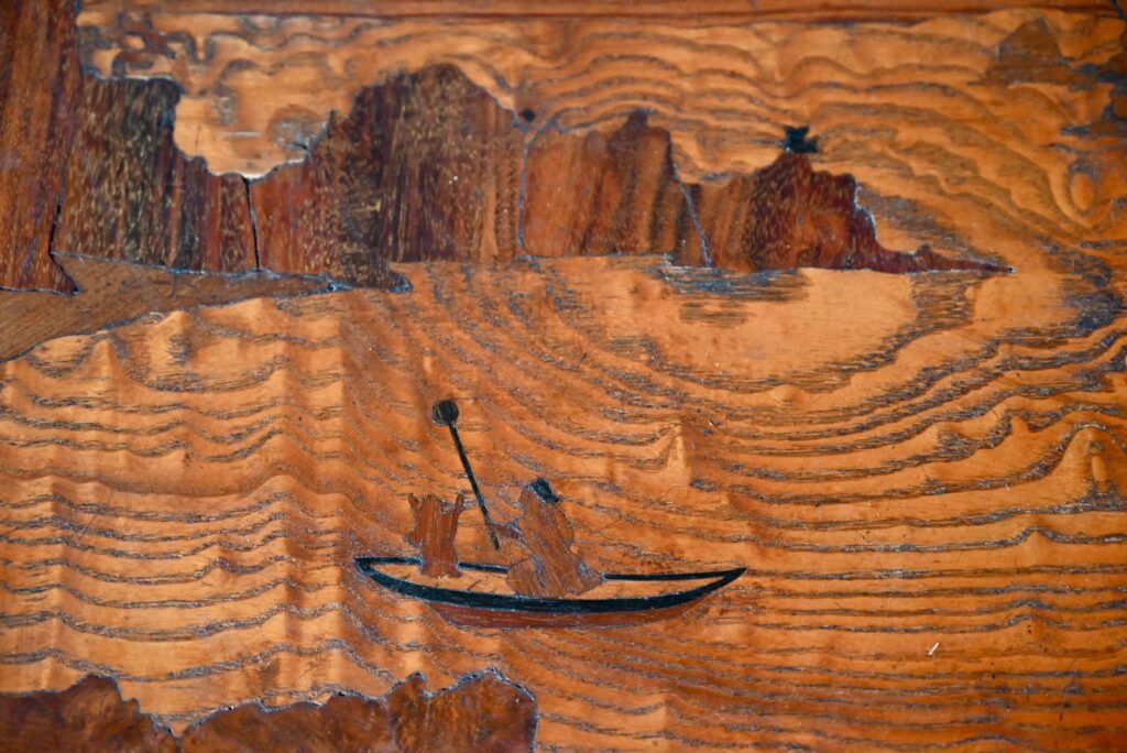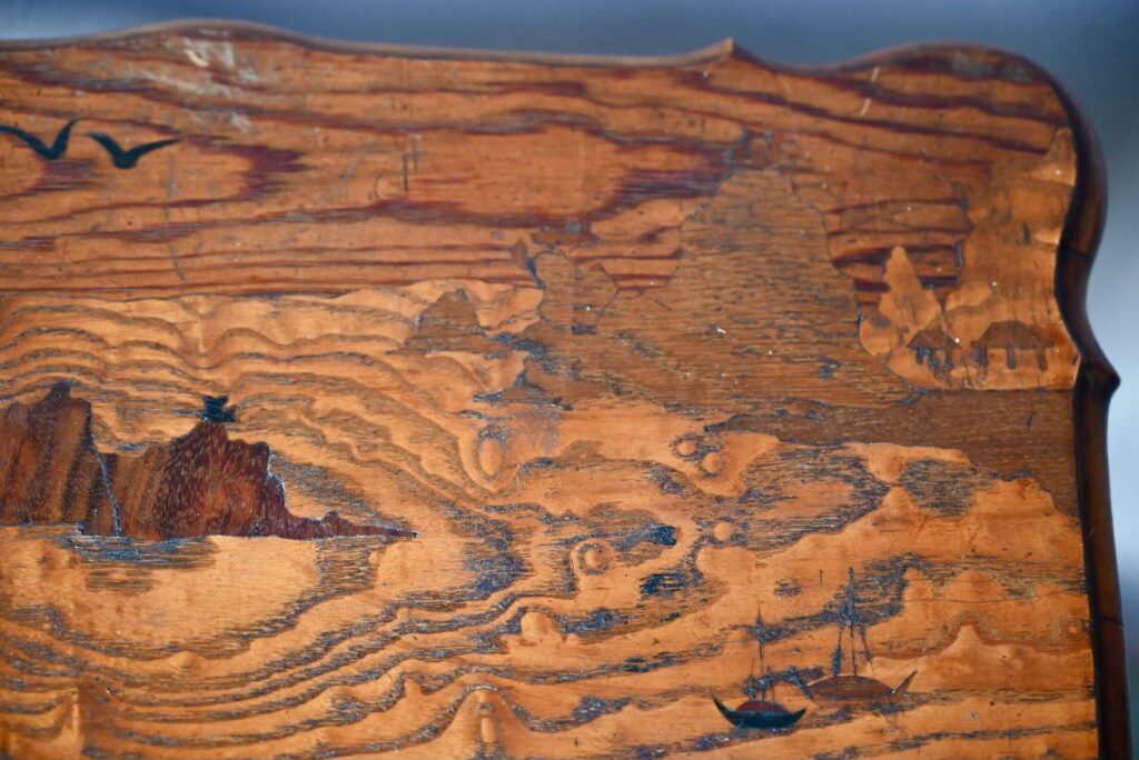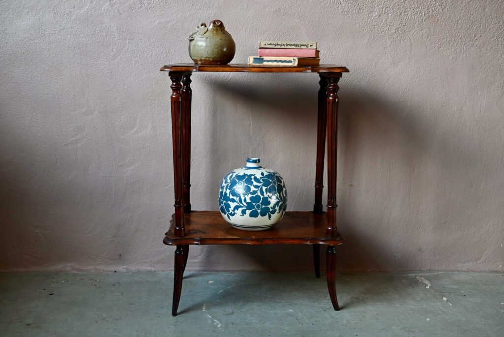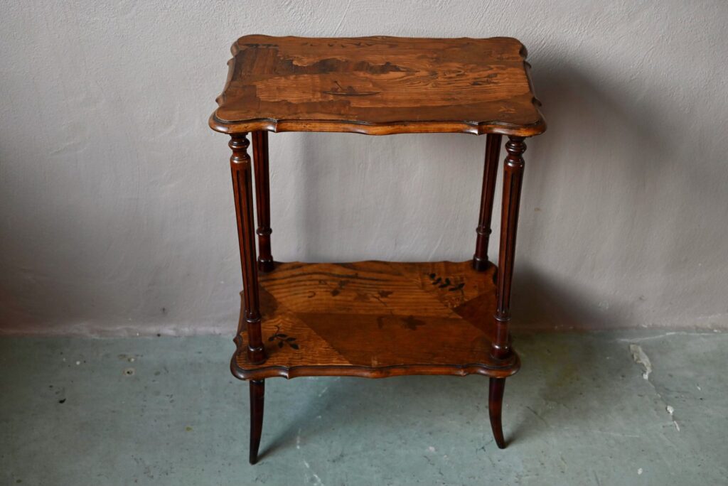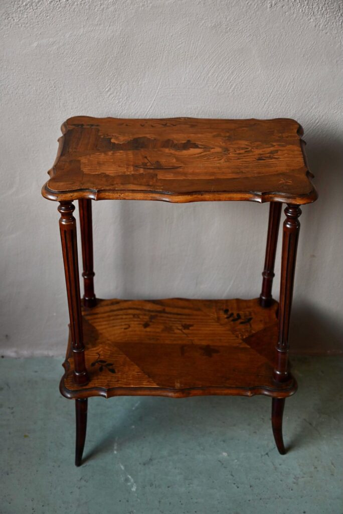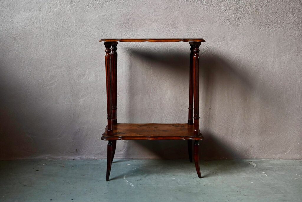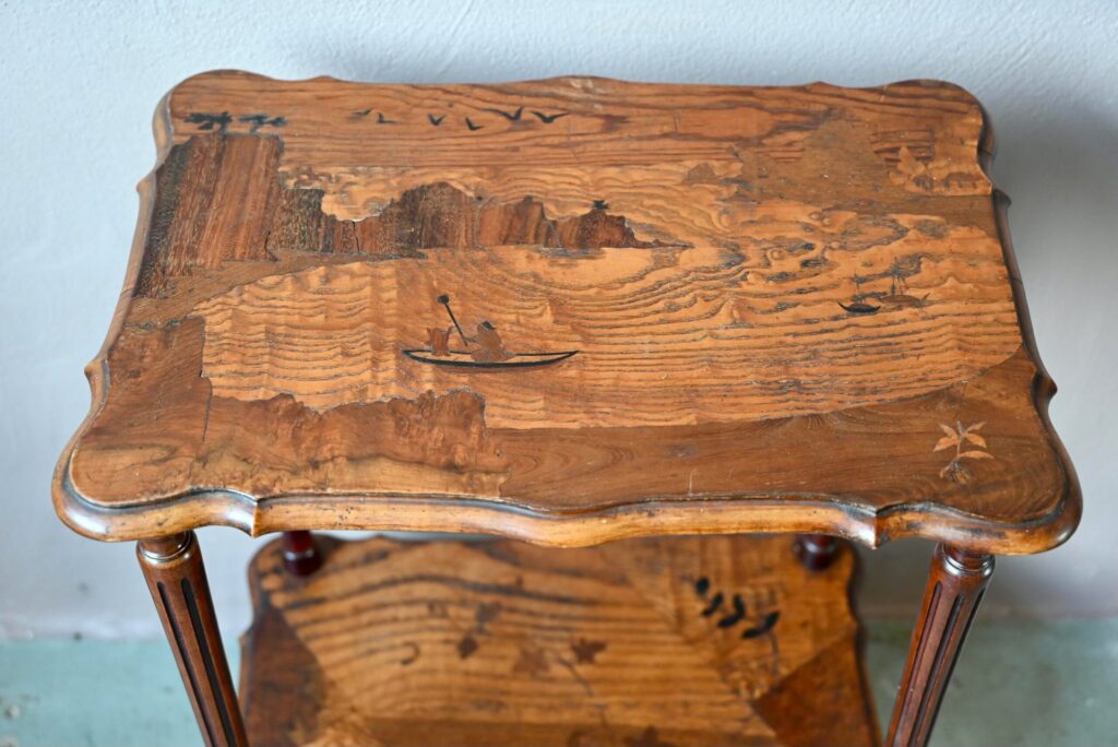 Cette jolie table à thé à double plateau date des années 1920. Dans un format de console, elle est constituée d’un plateau et d’une étagère portés par 4 pieds cambrés. Les plateaux sont en bois marqueté : une baie et ses pêcheurs & des feuilles de lierre. Le dessin est d’une grande réserve, sobre et élégant, un brin orientaliste. Nous aimons l’alliance des essences et les lignes Art Nouveau élégantes et douces. Avec son caractère atypique, nous imaginons parfaitement ce petit meuble en console dans une entrée, comme desserte de salle à manger, ou présentoir dans une jolie boutique.