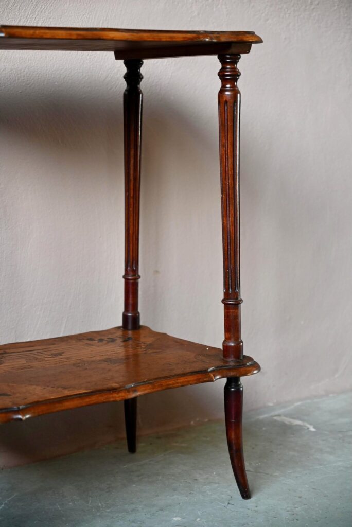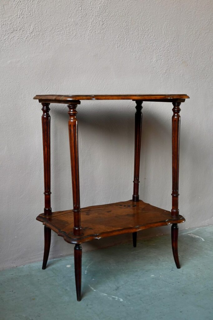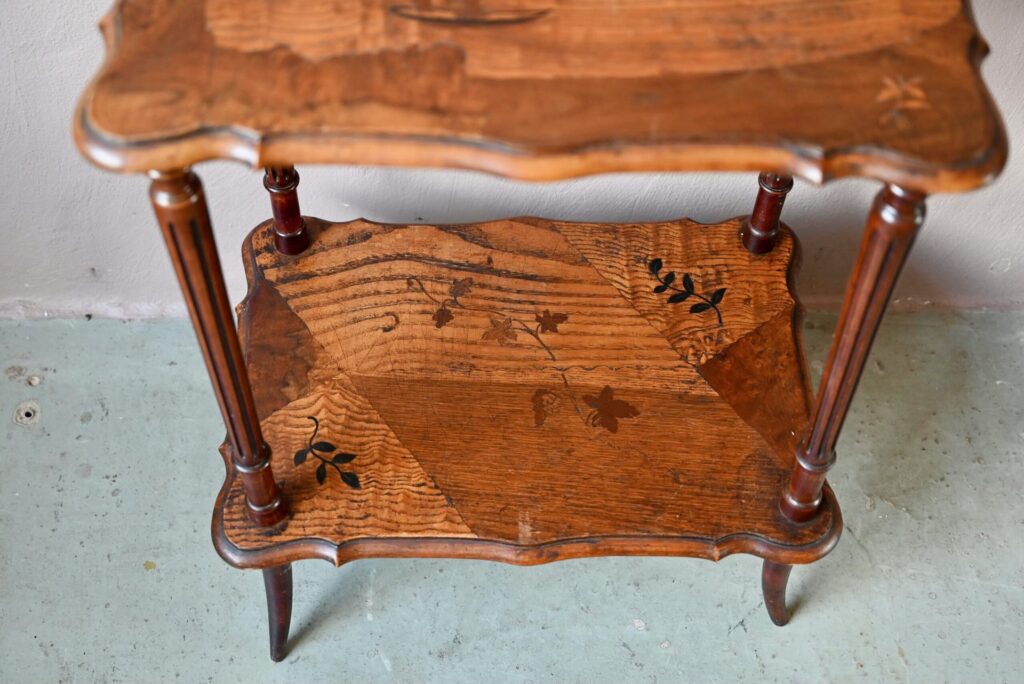 La table à thé est ancienne, son design s’inscrit dans l’esprit Art Nouveau 1900-1920. Des rayures sont visibles sur les plateaux. Le bois est sain, d’une teinte profonde. Le meuble est de très belle facture et fonctionnel.
