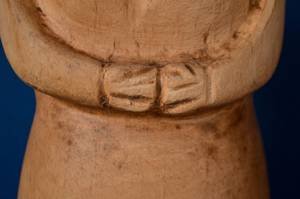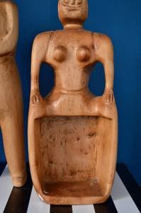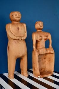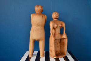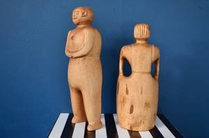 Ces pièces uniques sont en très bon état général. Elles ont été sculptées à la main. Le bois présente une belle patine naturelle. La sculpture de l’homme porte le monogramme “PA” gravé sous sa base, une signature discrète de son créateur.
