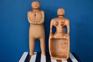 Énorme coup de cœur pour ce duo de sculptures au charme singulier, tout droit sorties d’un atelier italien des années 70. Ces deux personnages totem , un homme et une femme, incarnent à merveille l’esprit de l’art naïf ou de l’art brut, avec leurs formes stylisées et leurs expressions doucement souriantes. Taillées à la main dans un bois massif clair, elles possèdent une présence à la fois douce et puissante. C’est un duo qui raconte une histoire, parfaite pour apporter une touche d’authenticité et de chaleur à une bibliothèque, une console d’entrée ou une cheminée.