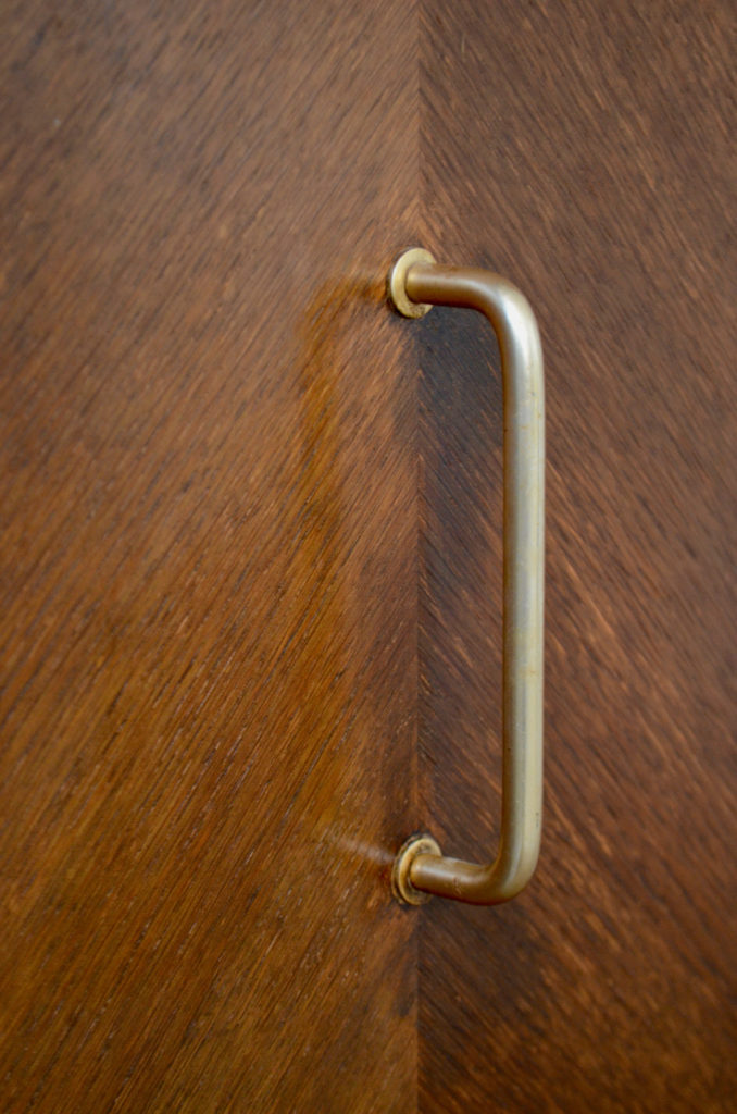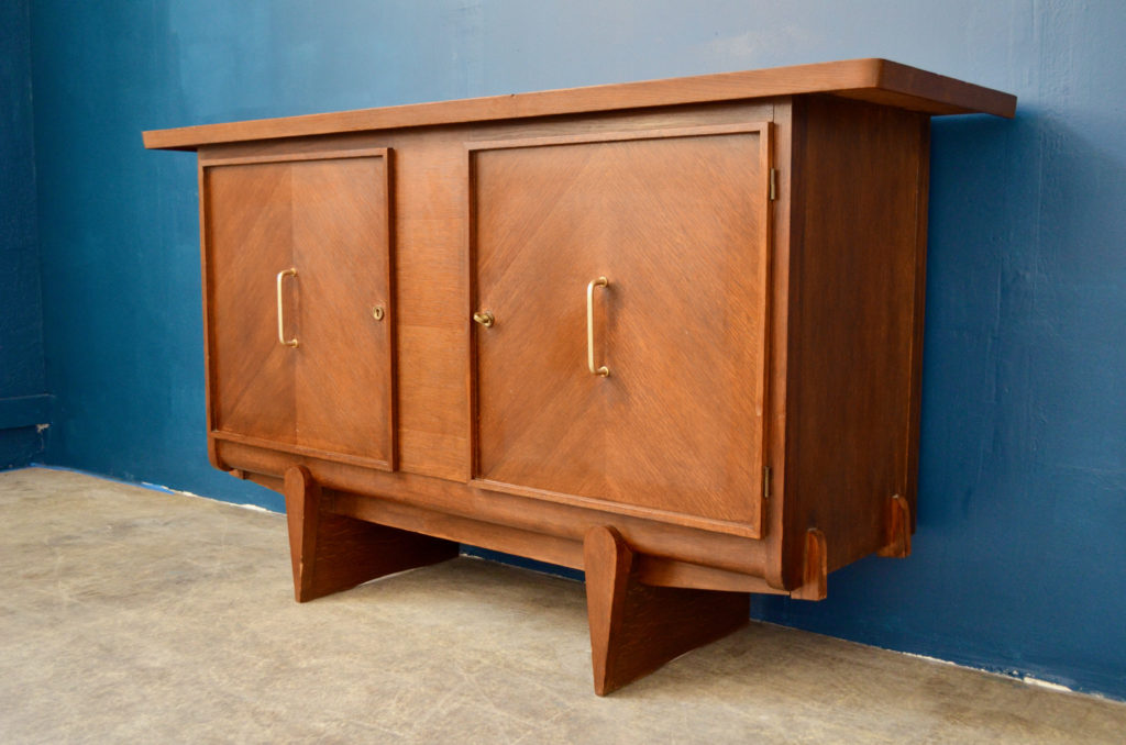 L’enfilade est ancienne et date des années 40. Elle est en très bel état, en bois massif et placage chêne à la teinte profonde. Le vaisselier comprend un vaste caisson fermer par deux portes battantes. Les poignées en métal doré sont d’origine. Quelques traces d’usage sont présentes sur le plateau, visibles en photo.