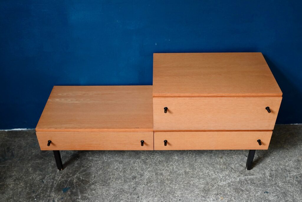 Superbe teinte lumineuse et silhouette structurée, cette enfilade des années 60 à étages est élégante et intemporelle. Sa forme est originale, le mélange des matériaux la rend moderne. Elle s’avère pratique avec ses 2 larges tiroirs et sa niche abattante. Facile à intégrer, on l’imagine meuble TV ou Hifi dans un salon cosy.