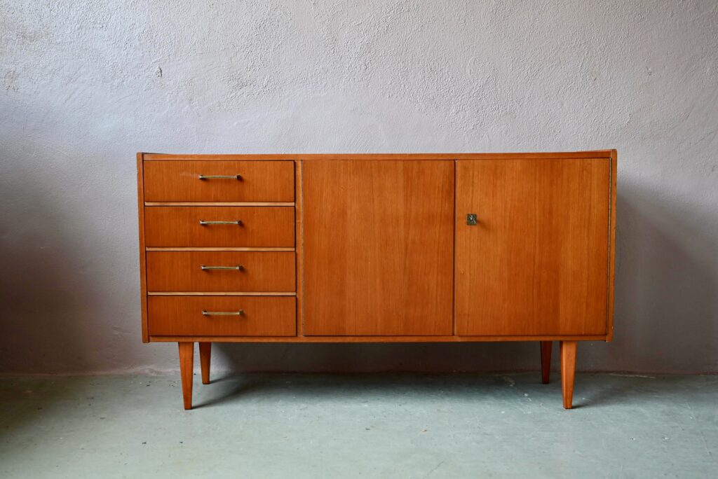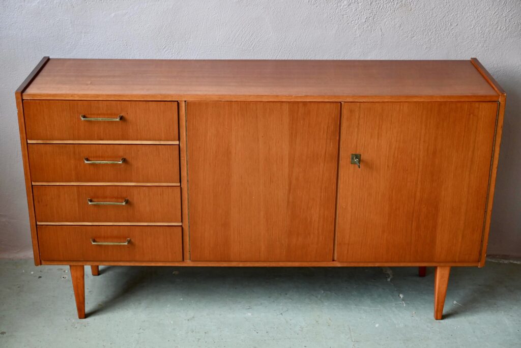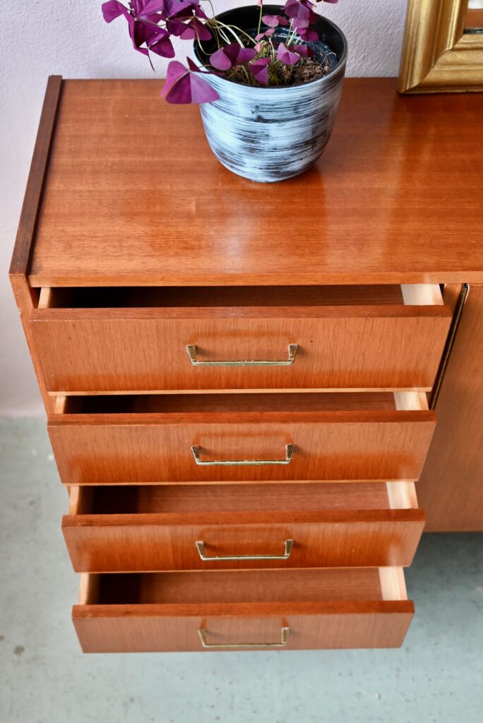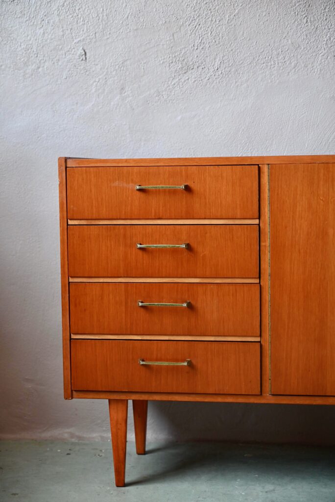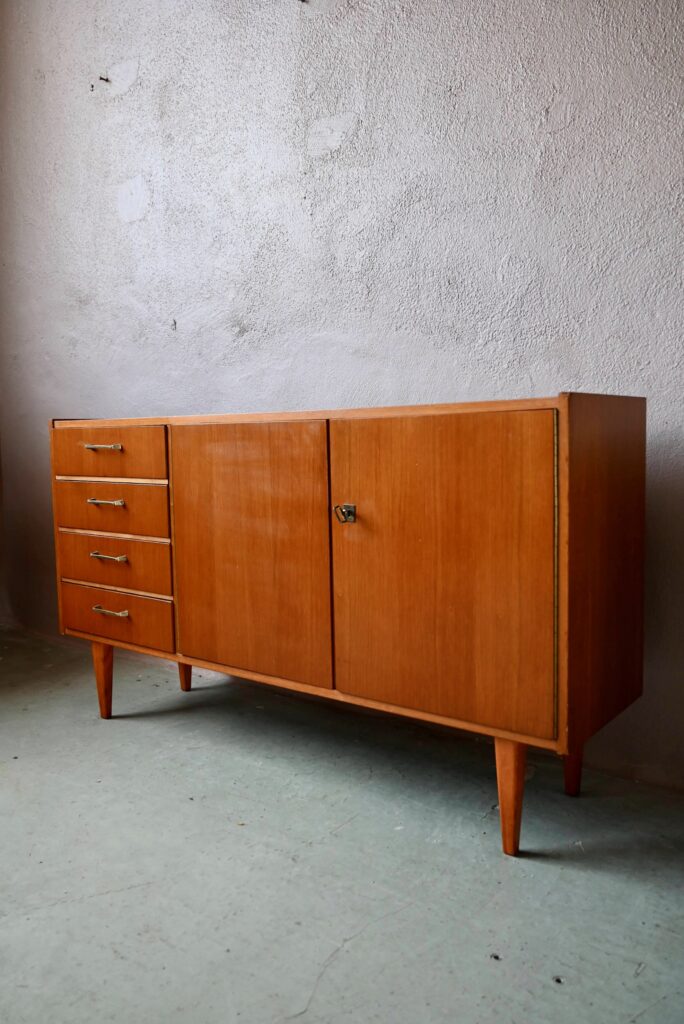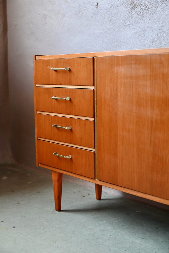 L’enfilade est ancienne et date des années 60. La teinte est chaleureuse, les lignes sont sobres et efficaces. Le meuble permet un rangement très pratique : 4 tiroirs et un vaste caisson à étagère. Les poignées en laiton doré sont d’origine, ainsi que clef, entrée et serrure. L’enfilade est stable et en bel état. Quelques traces d’usage sont visibles sur le plateau et certaines arêtes du meuble, de petites traces d’eau sur les façades de tiroirs, visibles en photo.