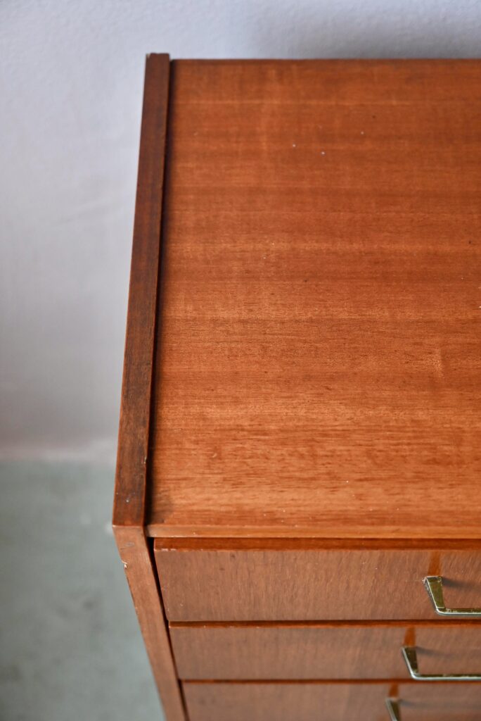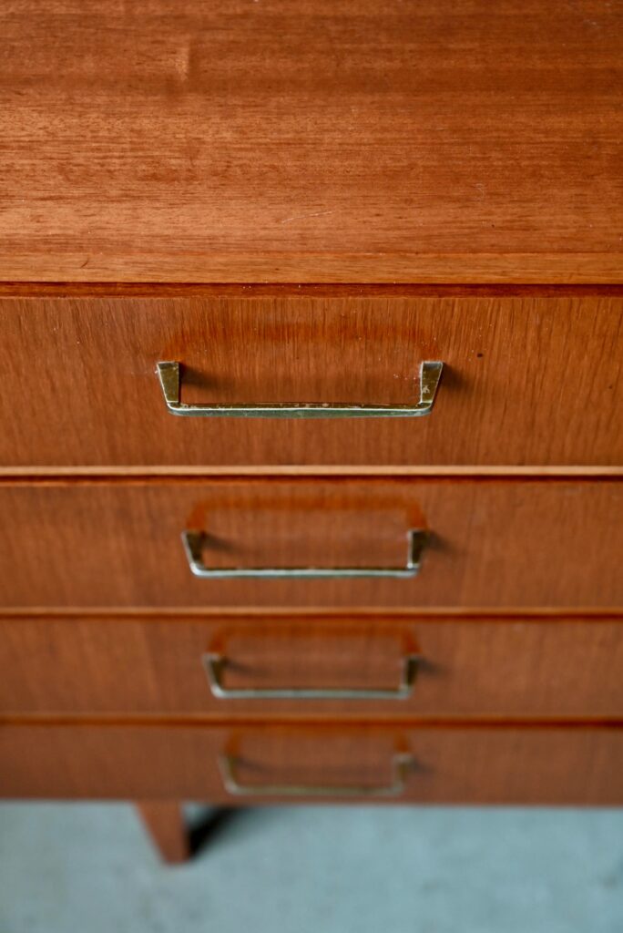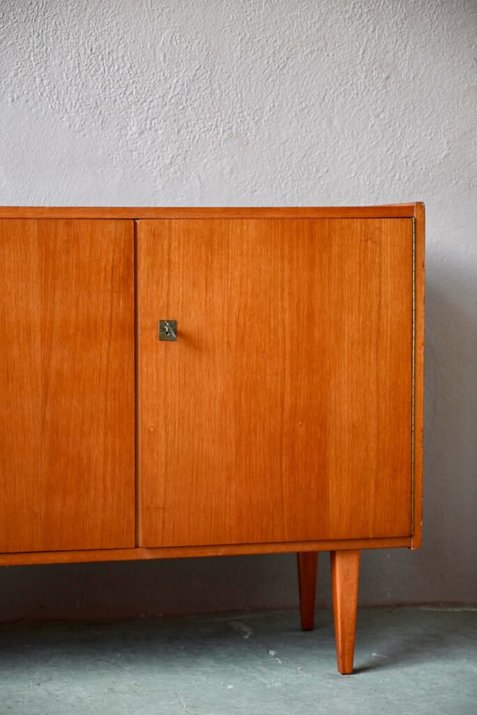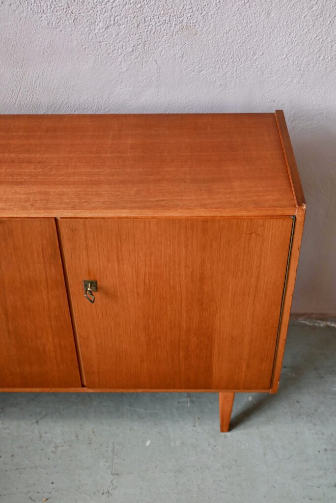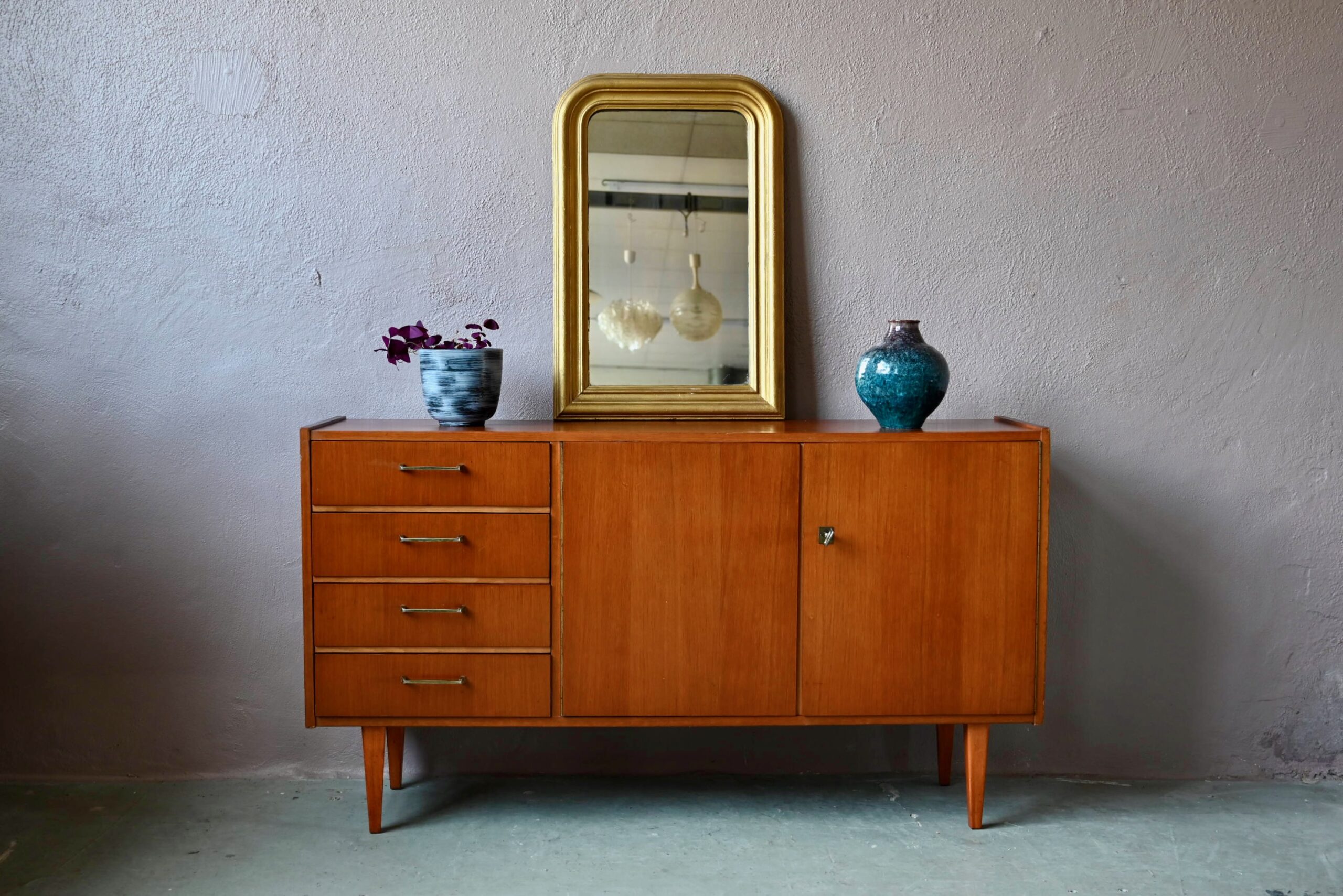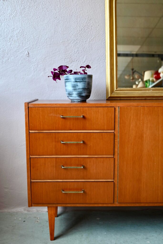 L’enfilade est ancienne et date des années 60. La teinte est chaleureuse, les lignes sont sobres et efficaces. Le meuble permet un rangement très pratique : 4 tiroirs et un vaste caisson à étagère. Les poignées en laiton doré sont d’origine, ainsi que clef, entrée et serrure. L’enfilade est stable et en bel état. Quelques traces d’usage sont visibles sur le plateau et certaines arêtes du meuble, de petites traces d’eau sur les façades de tiroirs, visibles en photo.