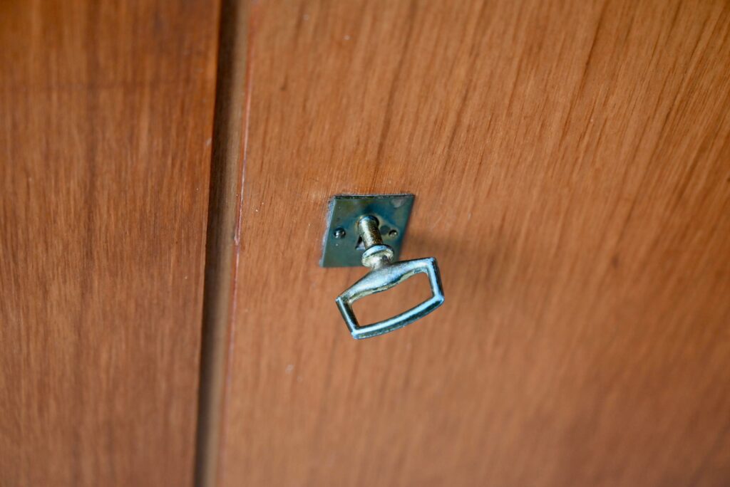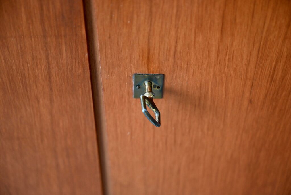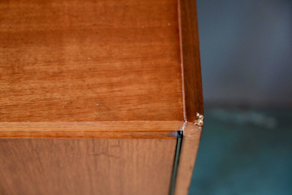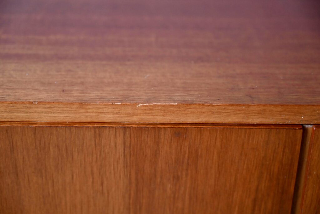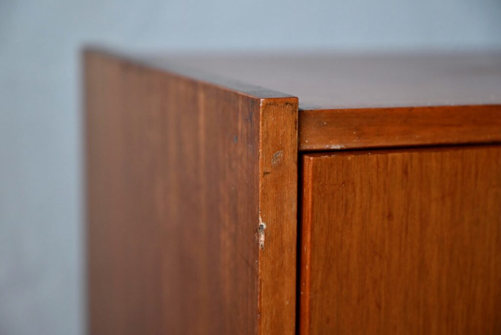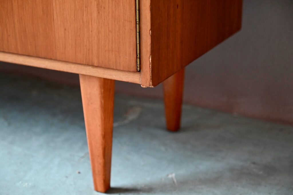 L’enfilade est ancienne et date des années 60. La teinte est chaleureuse, les lignes sont sobres et efficaces. Le meuble permet un rangement très pratique : 4 tiroirs et un vaste caisson à étagère. Les poignées en laiton doré sont d’origine, ainsi que clef, entrée et serrure. L’enfilade est stable et en bel état. Quelques traces d’usage sont visibles sur le plateau et certaines arêtes du meuble, de petites traces d’eau sur les façades de tiroirs, visibles en photo.