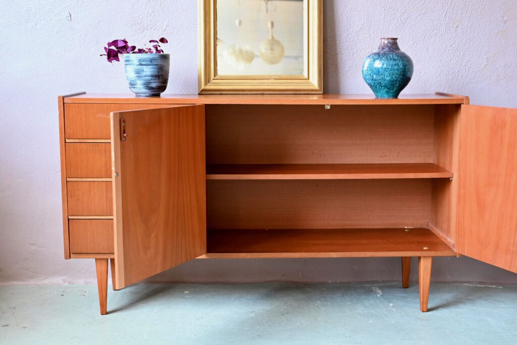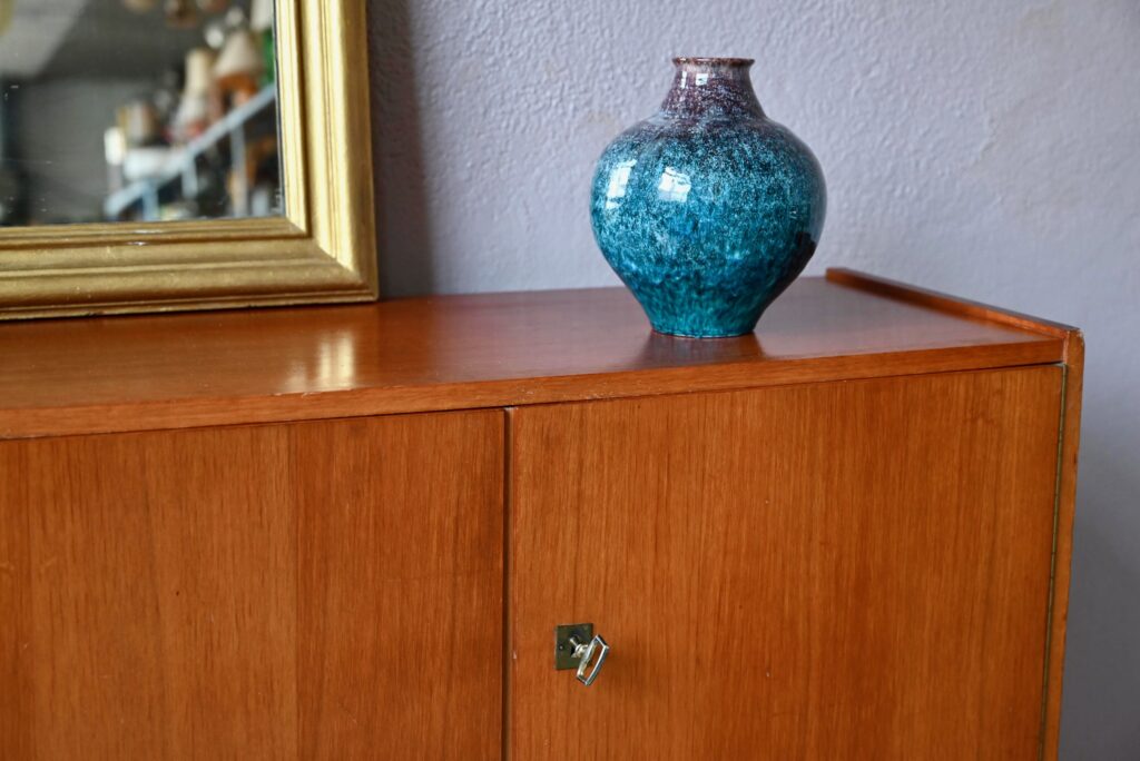 Sobre grâce à ses lignes modernistes, cette belle enfilade des années 60 est élégante et intemporelle. Sa teinte est profonde et pétillante. Sans fioriture, l’enfilade est de très jolie facture et facile à intégrer. Son caisson, monté sur un fin piétement, dispose de 4 tiroirs et d’un large caisson fermé par des portes battantes. Parfait meuble TV et Hifi, ce bahut sera utile et très élégant dans le salon ou l’entrée, agrémenté de quelques objets déco fétiches.