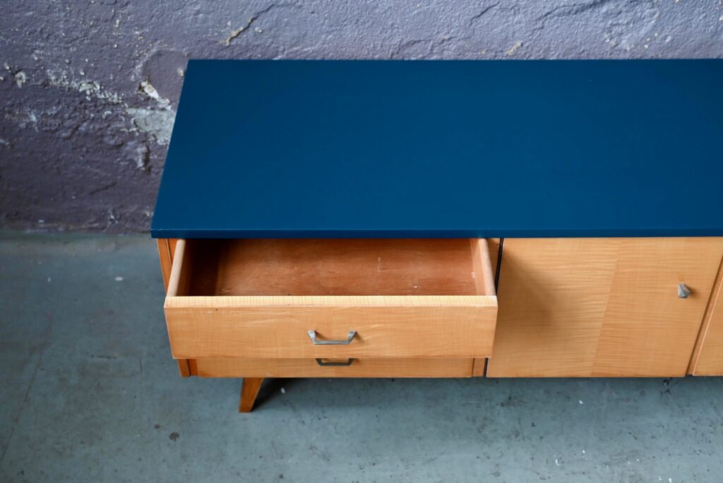 Cette petite enfilade est en provenance directe des années 60. Elle est pleine de charme avec ses formes vintage, ses pieds compas et la teinte claire de sa façade. Ses dimensions réduites en font un meuble TV ou Hifi parfait. Les lignes, dans l’air du temps, sont classiques et faciles à intégrer. Le plateau peint bleu franc, apporte de la profondeur au meuble. Cette petite enfilade se révèlera aussi un espace de rangement pratique, grâce à ses 2 compartiments et ses trois larges tiroirs.