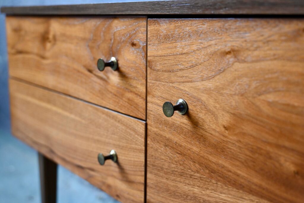 La petite enfilade est ancienne et date des années 60. Elle est en bel état. Les traces d’usage sont discrètes, des marques sont visibles à l’intérieur du caisson. Les boutons en laiton doré sont d’origine.