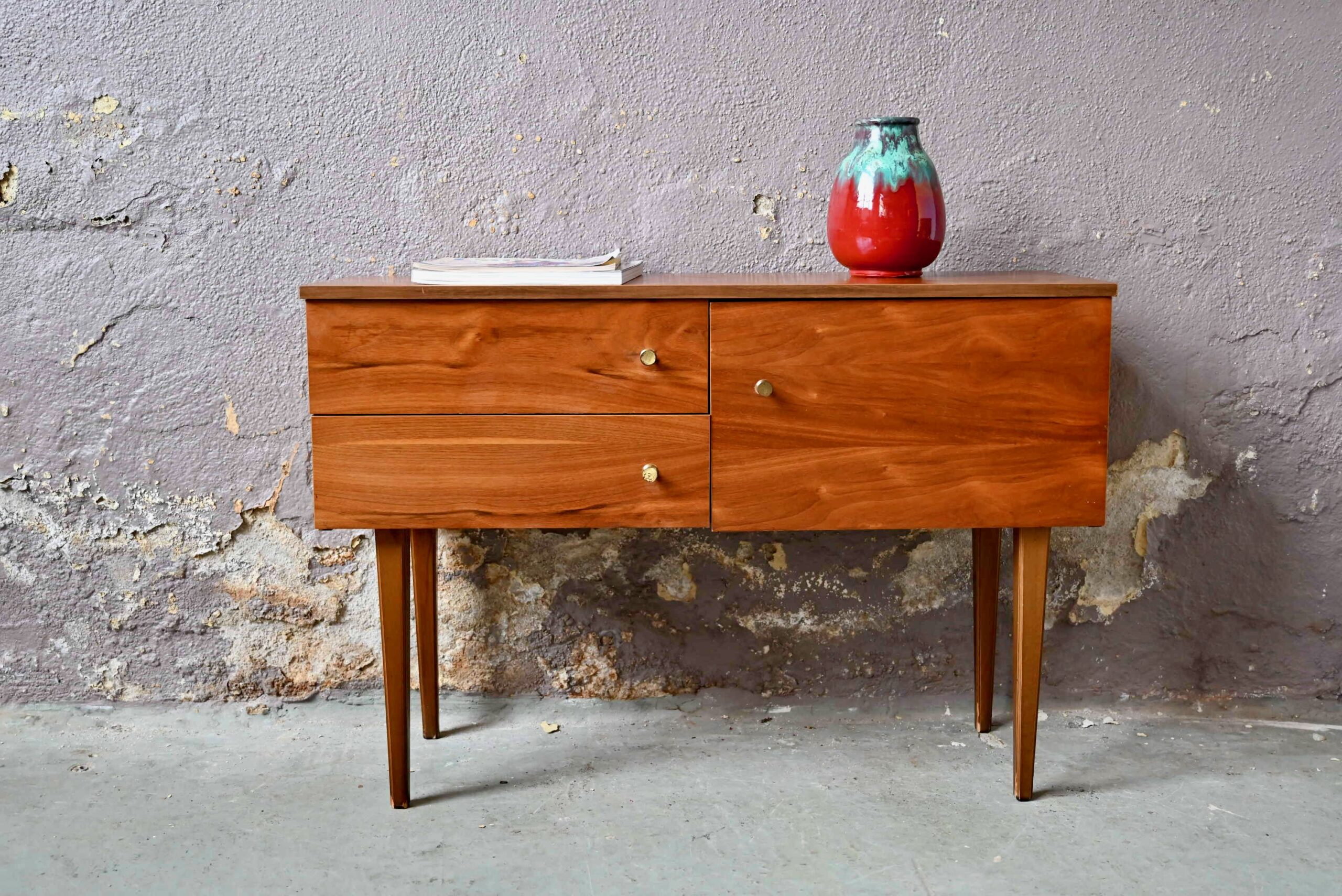Cette jolie petite enfilade des années 60 est à la fois simple et originale. Son caisson est minimaliste et haut perché. Il comprend plusieurs espaces de rangement : un caisson et deux larges tiroirs. Ces dimensions pratiques en font un meuble TV ou Hifi idéal. Des boutons en métal doré en forme de toupie et un bois joliment veiné complètent le look rétro et pétillant de ce meuble sideboard qu’on imagine dans l’entrée ou le salon.