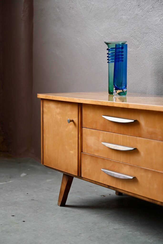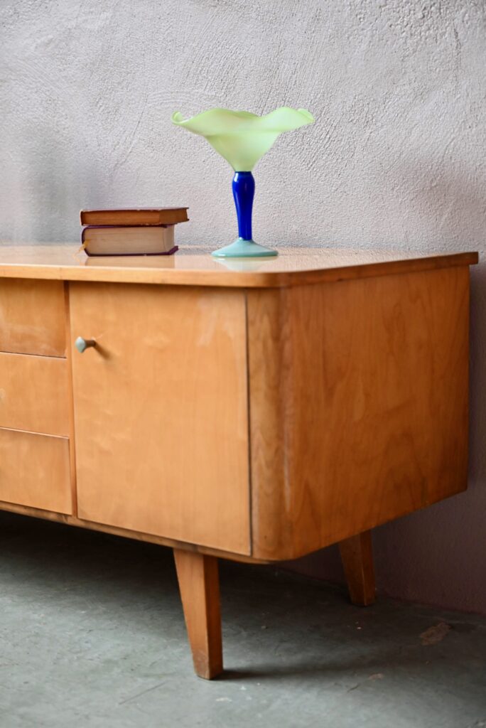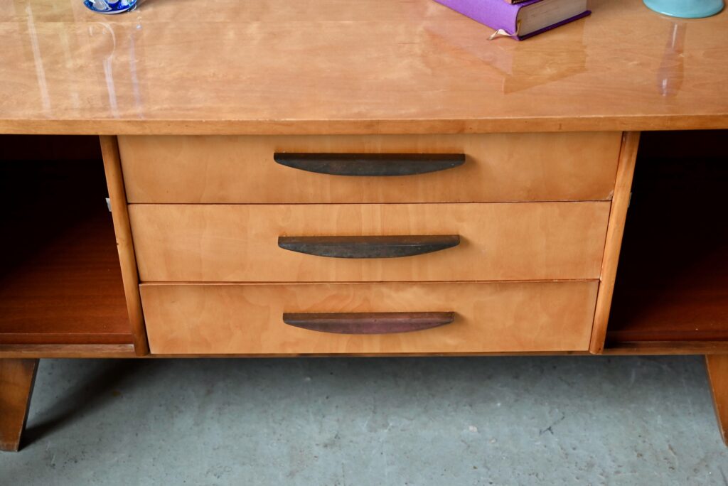 Pure production des années 1960, cette ancienne coiffeuse sixties se transforme aujourd’hui en enfilade. Petits pieds compas, proportions de rêve, teinte du bois joliment dorée, ce meuble bas est séduisant. Ses dimensions réduites en font un meuble télé TV ou Hifi parfait et totalement dans l’air du temps. Ses caissons et tiroirs permettront un peu de rangement. On aime beaucoup la teinte douce et lumineuse de ce petit bahut au charme rétro. Pas de doute, cette enfilade nous fait du gringue!