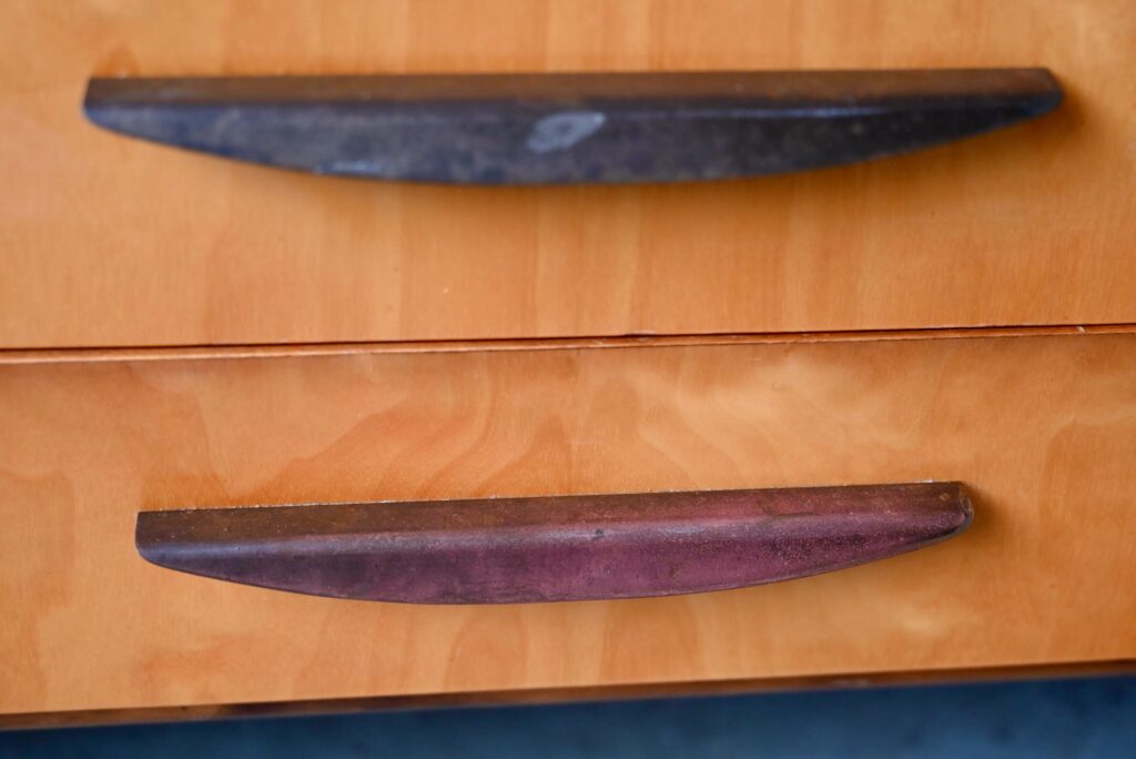 L’enfilade est en bois et placage de bois de teinte dorée et vernie. Elle dispose de 2 caissons et de 3 tiroirs, les poignées en laiton sont originales et patinées. Son passé de coiffeuse lui laisse une partie assombrie sur le plateau, visible sur les photos. Ancienne, le sideboard présente quelques marques d’usage sur le plateau visibles sur les photos. Une réparation est visible sur le flanc droit du meuble. Disposant à l’origine d’un plateau de verre, les trous laissés par les taquets sont visibles sur le plateau. L’enfilade est fonctionnelle et stable, les tiroirs coulissent parfaitement.