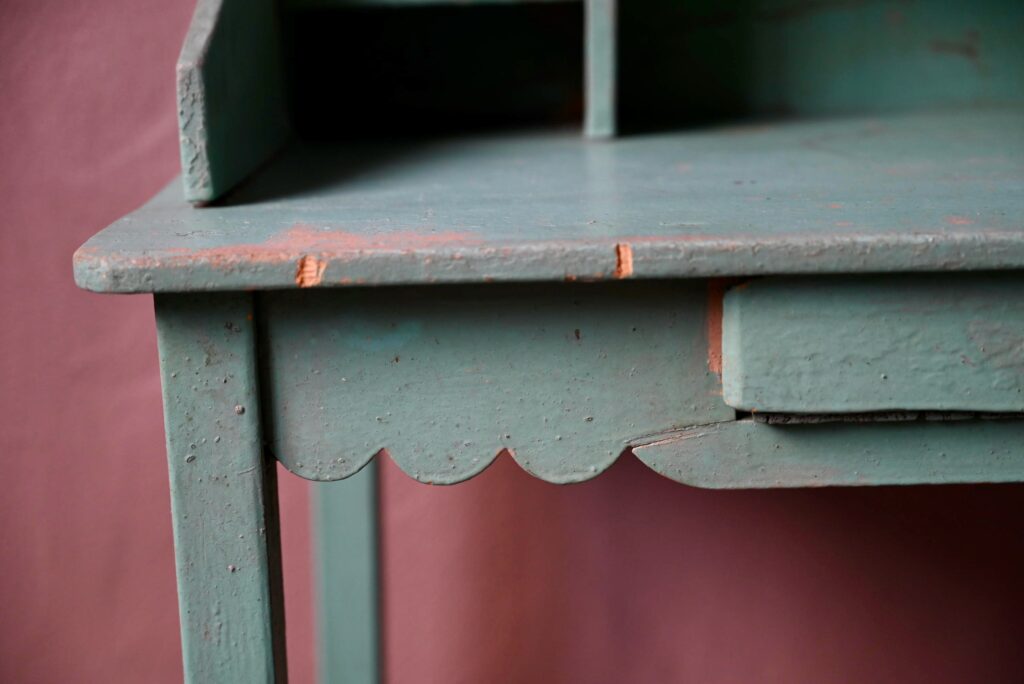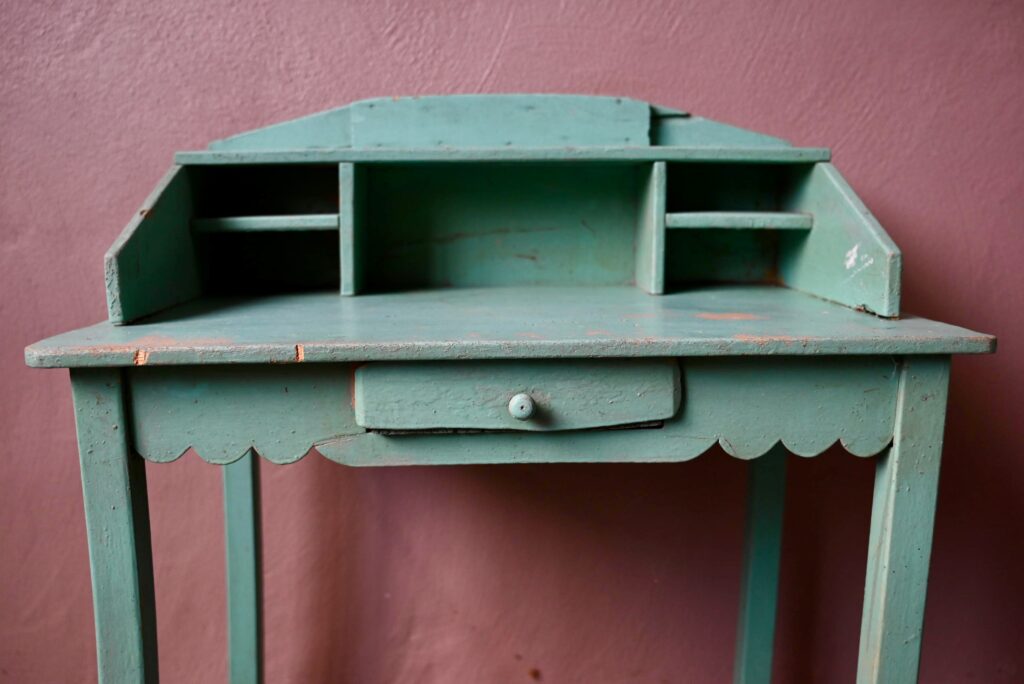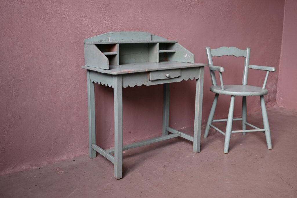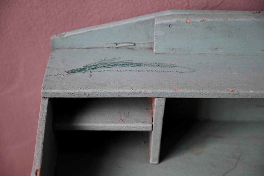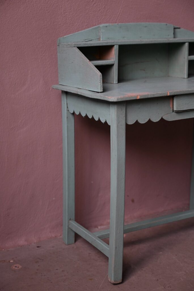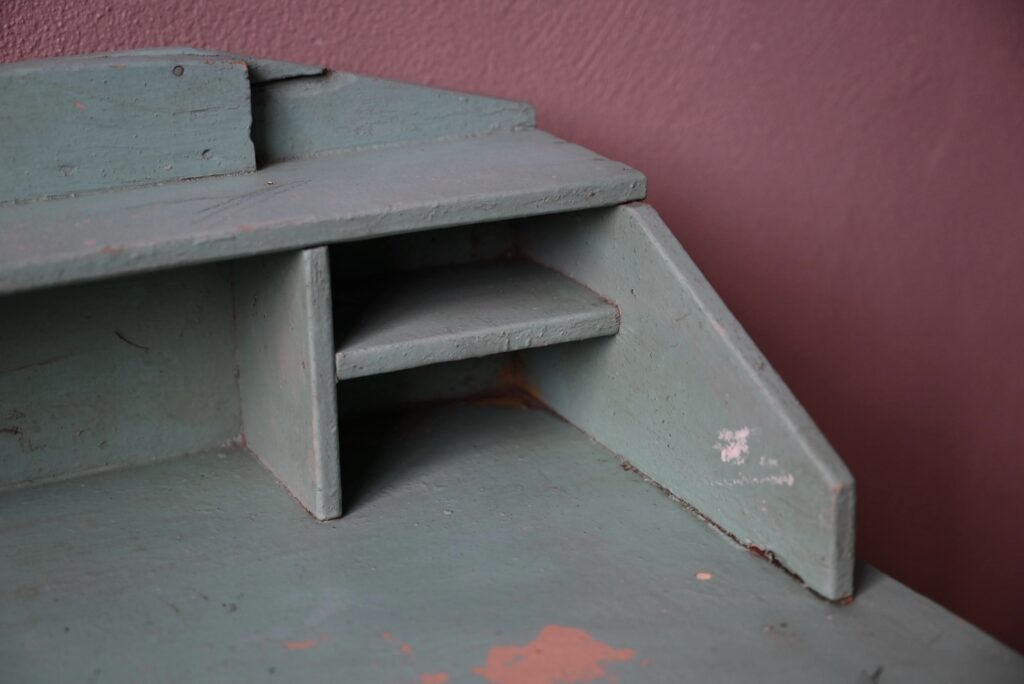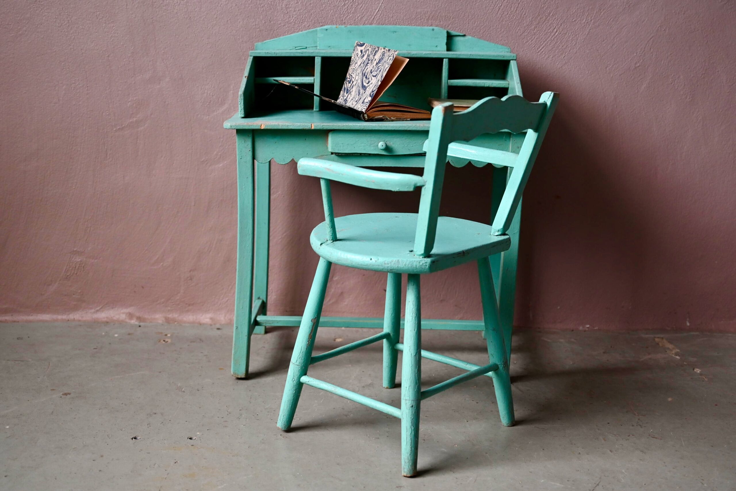 Le bureau est ancien, sa peinture vert eau vif est d’origine et patinée. La photo principale présente bien la teinte du meuble : vert céladon. Celle-ci ressort gris-vert sur certaines photos en raison de l’éclairage. Le bois est sain. Le plateau et son gradin à niches et tiroir affichent de nombreuses traces d’usage (traits de crayon, petits impacts, incisions au niveau de la tranche…) visibles en photo. Un tiroir permet un peu de rangement, un manque de bois est visible sur sa façade. La chaise est assortie.