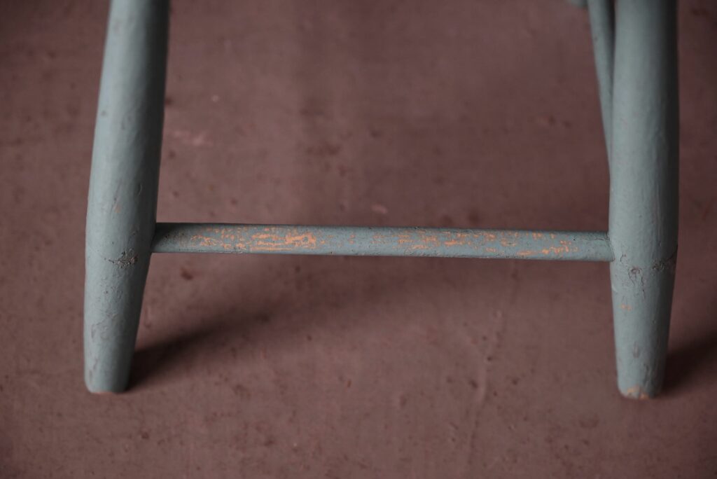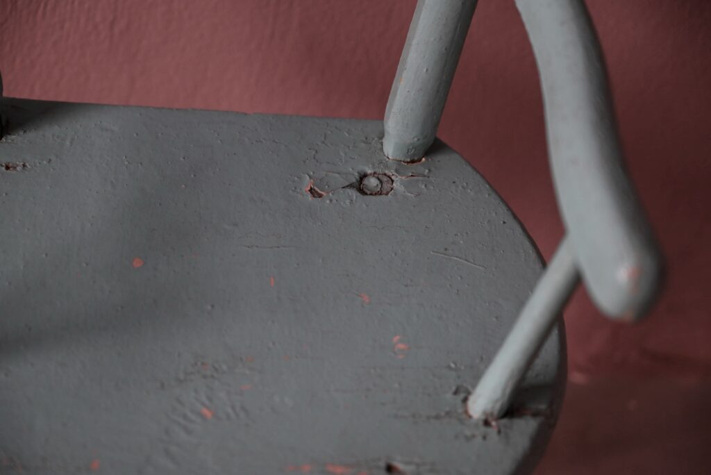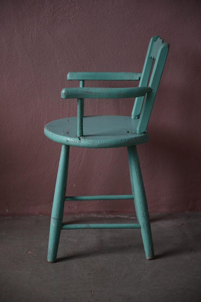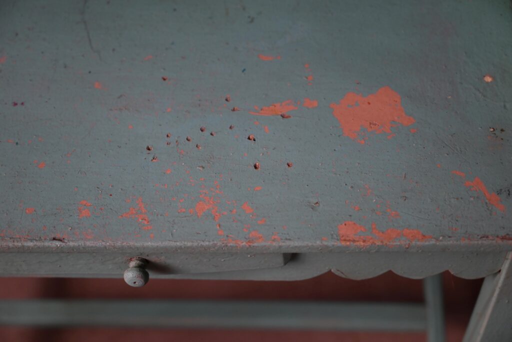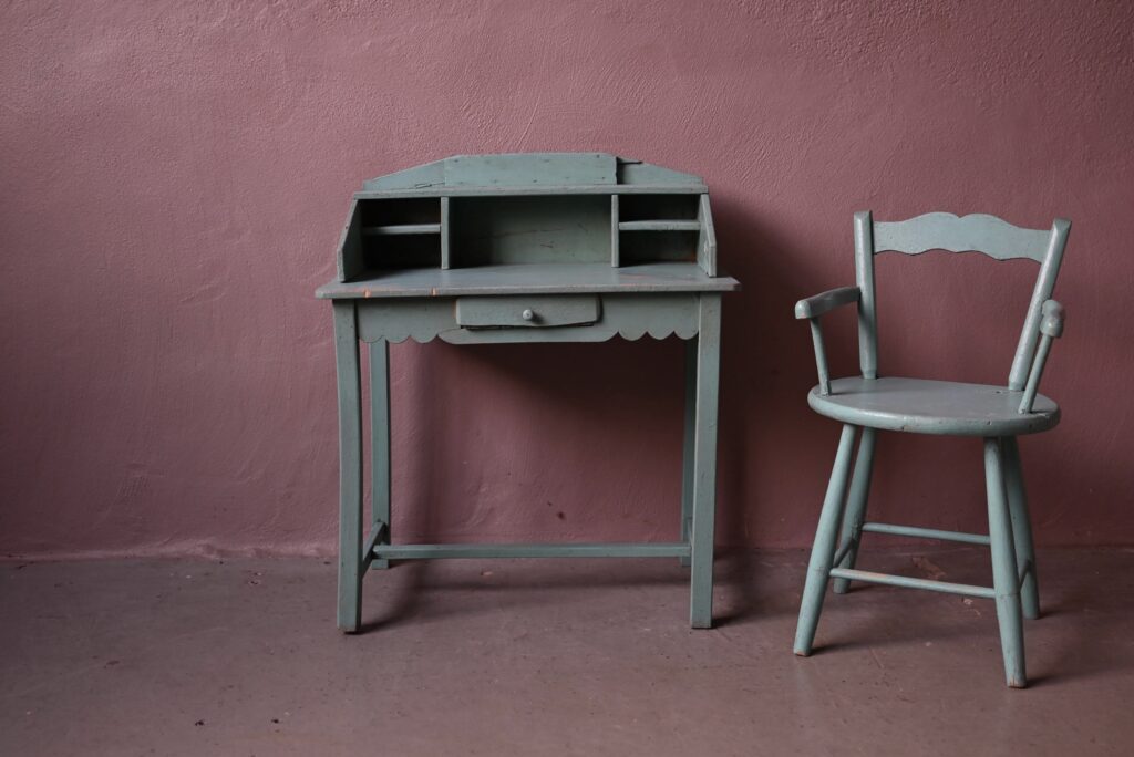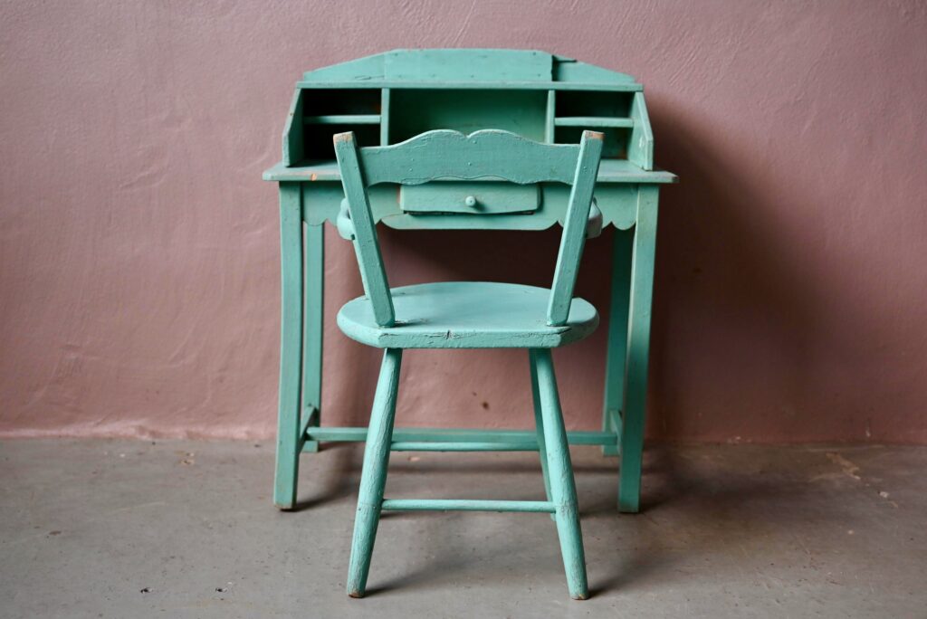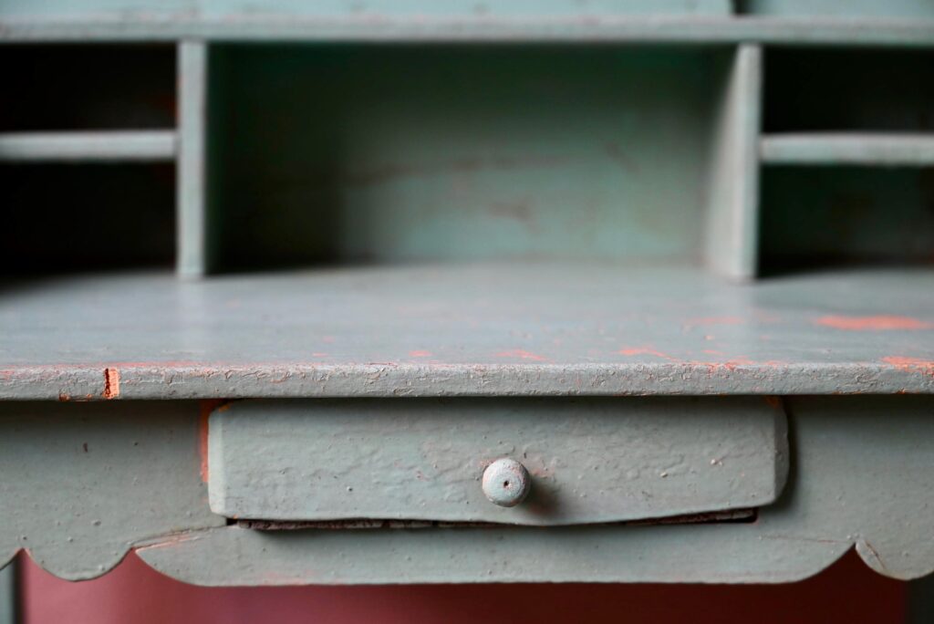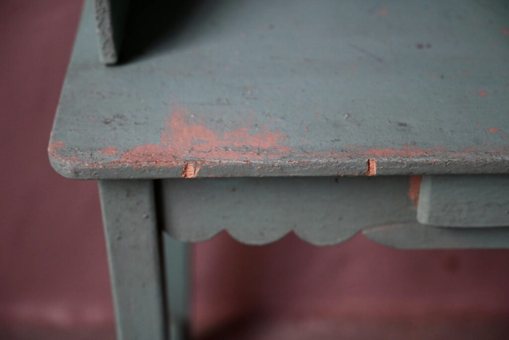 Le bureau est ancien, sa peinture vert eau vif est d’origine et patinée. La photo principale présente bien la teinte du meuble : vert céladon. Celle-ci ressort gris-vert sur certaines photos en raison de l’éclairage. Le bois est sain. Le plateau et son gradin à niches et tiroir affichent de nombreuses traces d’usage (traits de crayon, petits impacts, incisions au niveau de la tranche…) visibles en photo. Un tiroir permet un peu de rangement, un manque de bois est visible sur sa façade. La chaise est assortie.