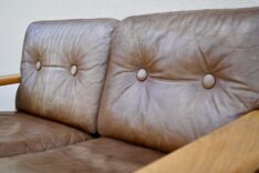 L’ensemble est composé d’un canapé 3 places, un canapé 2 place, un fauteuil et une table basse, de la ligne Bonanza, dessinée par Esko Pajamies et édités par Asko. La structure est en chêne massif de teinte blonde, mis en avant par le travail d’assemblage. Les assises sont moelleuses, souples et fermes à la fois. Le cuir lisse est chaleureux, d’une teinte profonde marron glacé, facile à intégrer. Des traces; décoloration et taches d’usage sont présentes et visibles en photo. La structure est en parfait état.