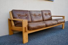 Classe et saisissant ne sont qu’euphémismes pour décrire ce superbe ensemble de salon des années 60. Inspiré par l’architecture brutaliste, le designer et architecte d’intérieur finlandais Esko Pajamies signe les lignes incroyables de ces canapés, fauteuil et table basse en chêne massif et cuir souple. Ruptures des lignes tout en rondeurs et assemblages visibles mettent en valeur les matières et le montage originale à queue droite. La sobriété reste de mise et l’on perçoit encore dans le minimalisme du dessin un souffle moderniste, héritage du design midcentury. L’éditeur Asko s’empare de ce vent nouveau et sera l’éditeur de ces pièces au design marquant et intemporel… ou quand le brutalisme se fait doux!