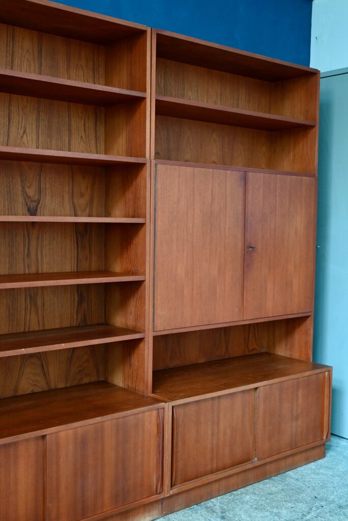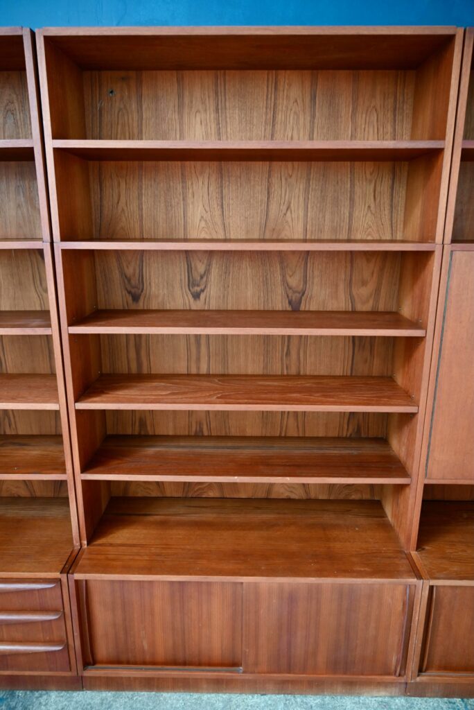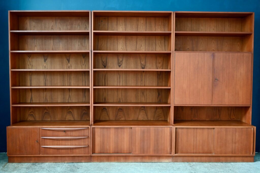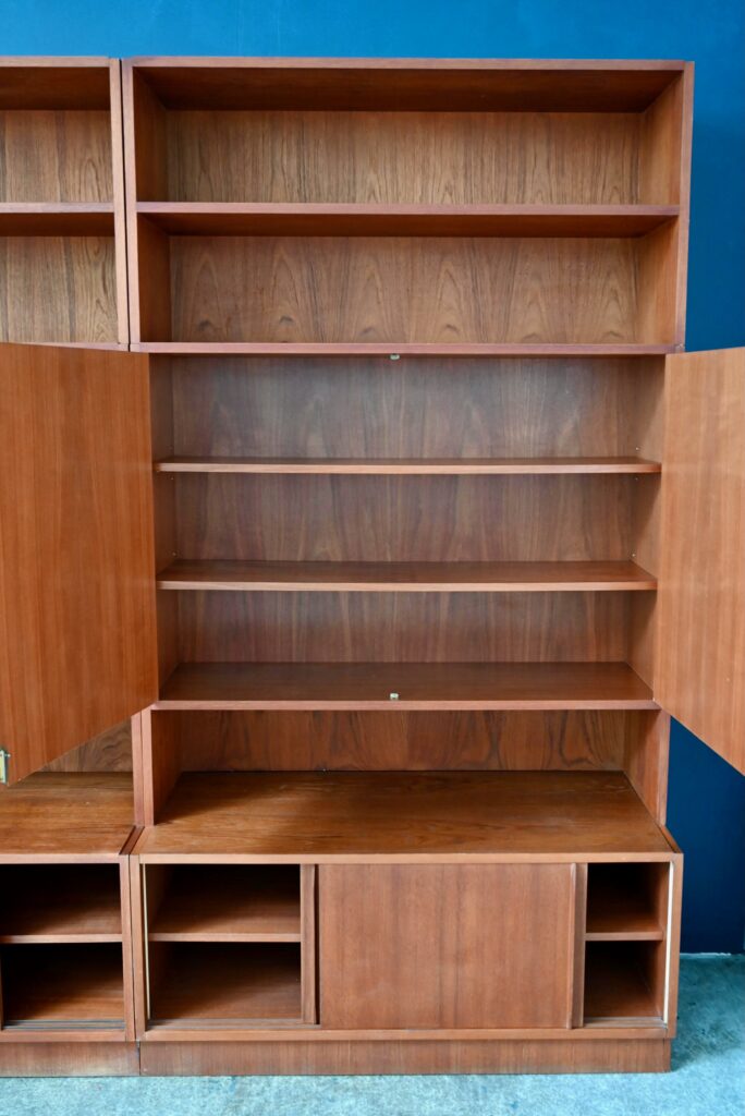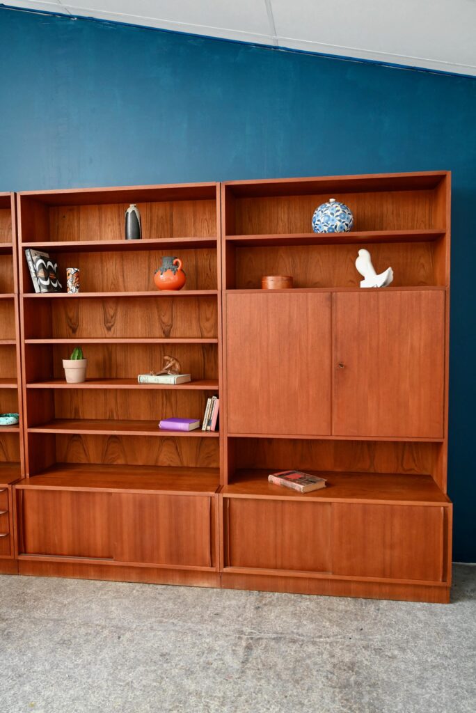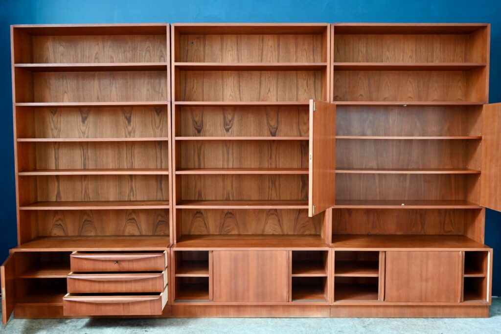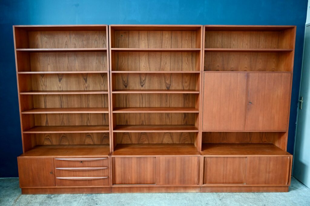 Ce grand ensemble de mobilier modulable est une production des années 60. Le designer Heinrich Riestenpatt propose une solution de rangement haut de gamme, fonctionnelle est adaptable à toutes les situations. Les éléments sont en teck et placage teck, Les 3 bibliothèques sont modulables : caisson, étagères et rehausse qui s’imbriquent parfaitement. Le caisson est plus profond et les étagères. L’ensemble dispose de tablettes, étagères, caissons de rangement, tiroirs, vaisselier fermé par des portes battantes Ce wall system élégant et de très belle qualité sera une bibliothèque idéal et meuble parfait pour présenter une déco choisie, meuble de salon pour la Hifi. L’ensemble est mis en valeur par la chaleur du teck au moyen de lignes évidentes et d’assemblages soignés.