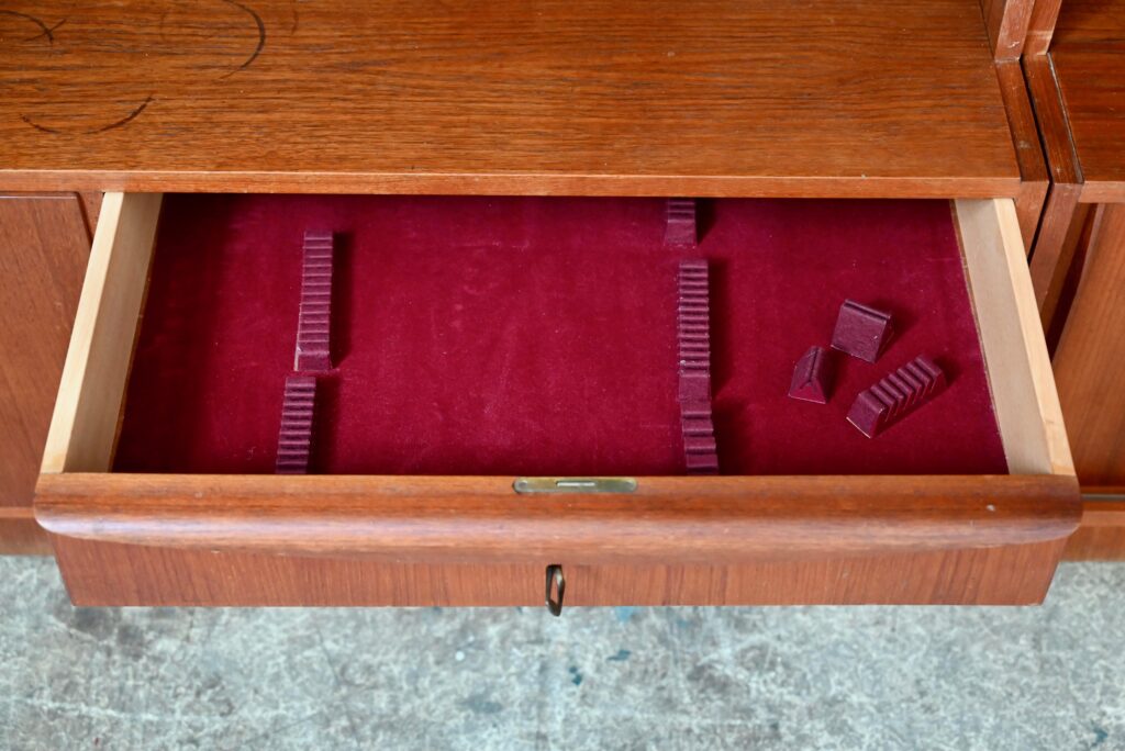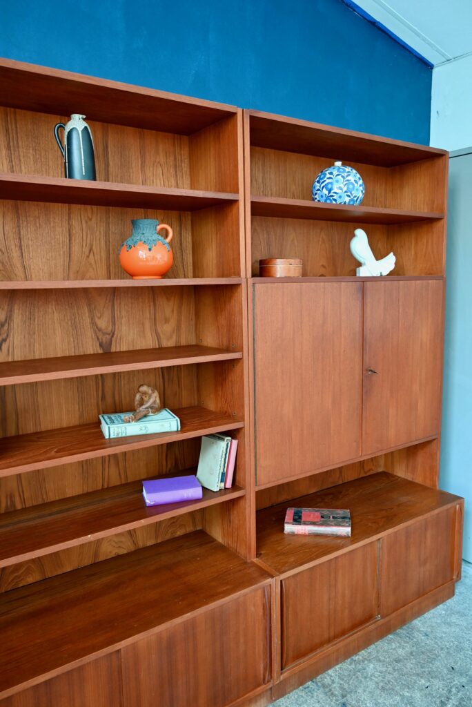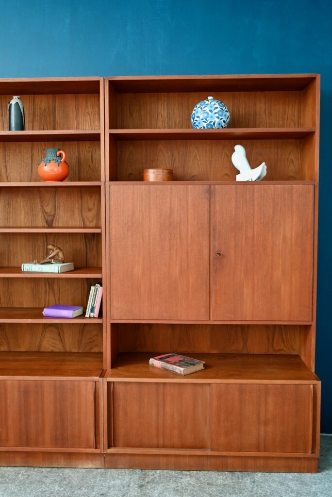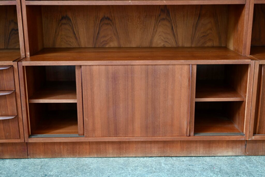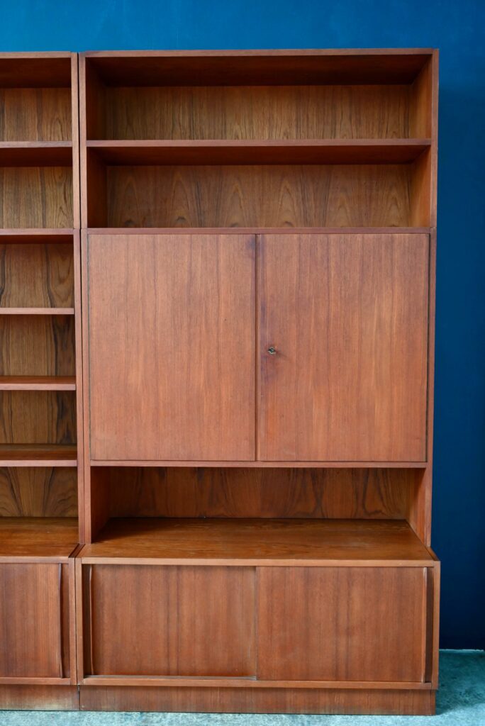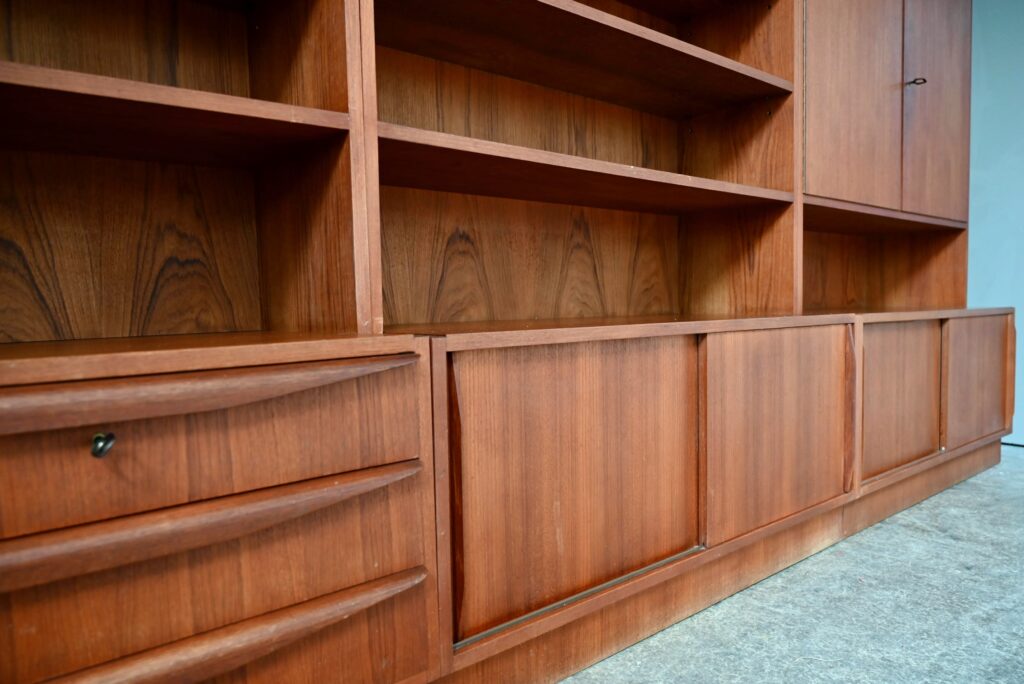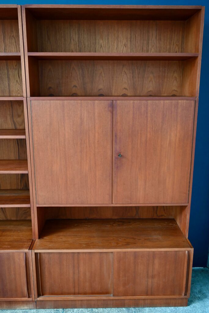 Ce grand ensemble de mobilier modulable est une production des années 60. Le designer Heinrich Riestenpatt propose une solution de rangement haut de gamme, fonctionnelle est adaptable à toutes les situations. Les éléments sont en teck et placage teck, Les 3 bibliothèques sont modulables : caisson, étagères et rehausse qui s’imbriquent parfaitement. Le caisson est plus profond et les étagères. L’ensemble dispose de tablettes, étagères, caissons de rangement, tiroirs, vaisselier fermé par des portes battantes Ce wall system élégant et de très belle qualité sera une bibliothèque idéal et meuble parfait pour présenter une déco choisie, meuble de salon pour la Hifi. L’ensemble est mis en valeur par la chaleur du teck au moyen de lignes évidentes et d’assemblages soignés.