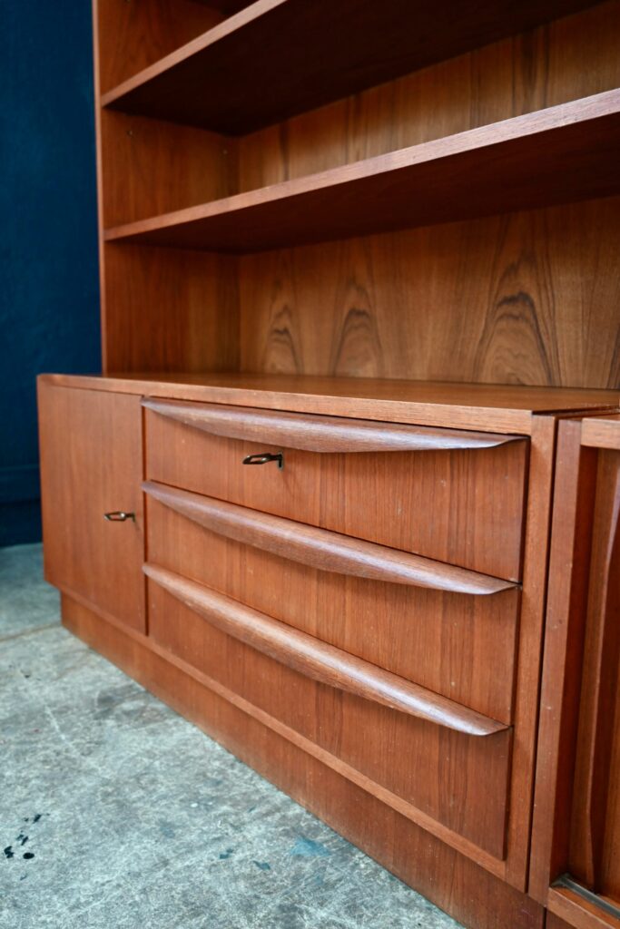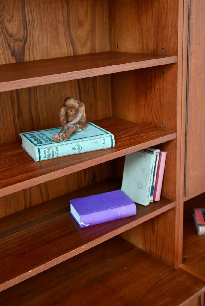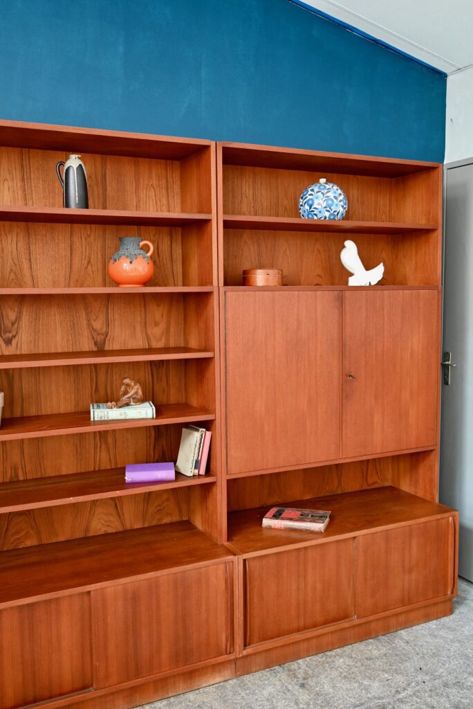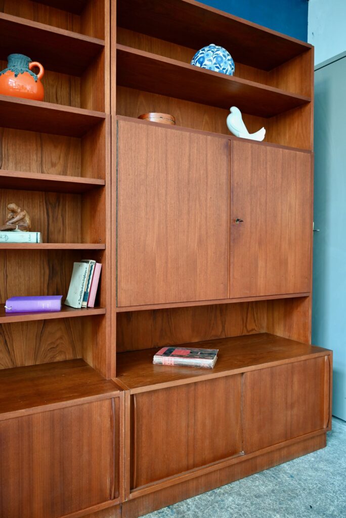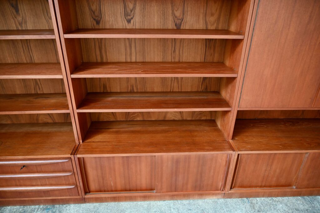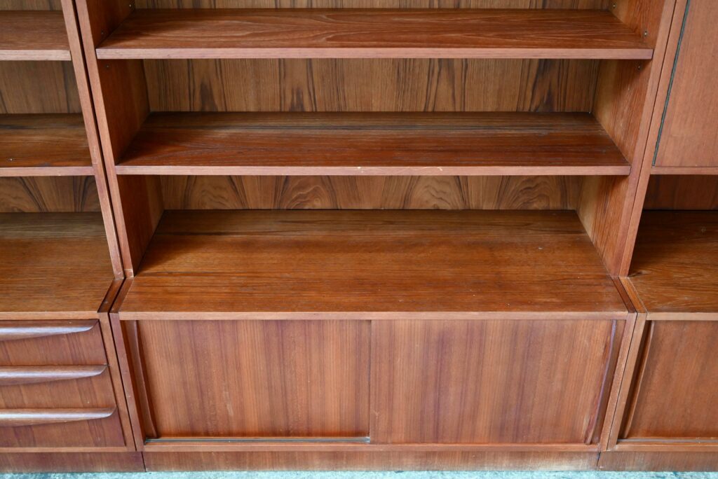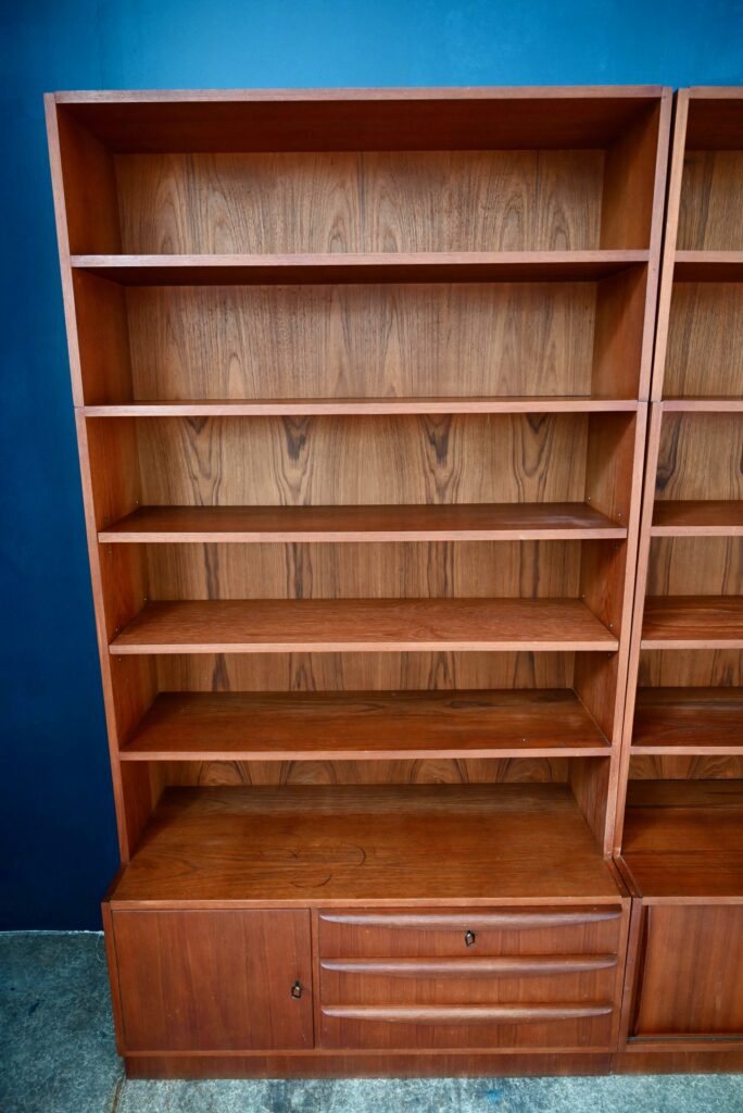 Ce grand ensemble de mobilier modulable est une production des années 60. Le designer Heinrich Riestenpatt propose une solution de rangement haut de gamme, fonctionnelle est adaptable à toutes les situations. Les éléments sont en teck et placage teck, Les 3 bibliothèques sont modulables : caisson, étagères et rehausse qui s’imbriquent parfaitement. Le caisson est plus profond et les étagères. L’ensemble dispose de tablettes, étagères, caissons de rangement, tiroirs, vaisselier fermé par des portes battantes Ce wall system élégant et de très belle qualité sera une bibliothèque idéal et meuble parfait pour présenter une déco choisie, meuble de salon pour la Hifi. L’ensemble est mis en valeur par la chaleur du teck au moyen de lignes évidentes et d’assemblages soignés.