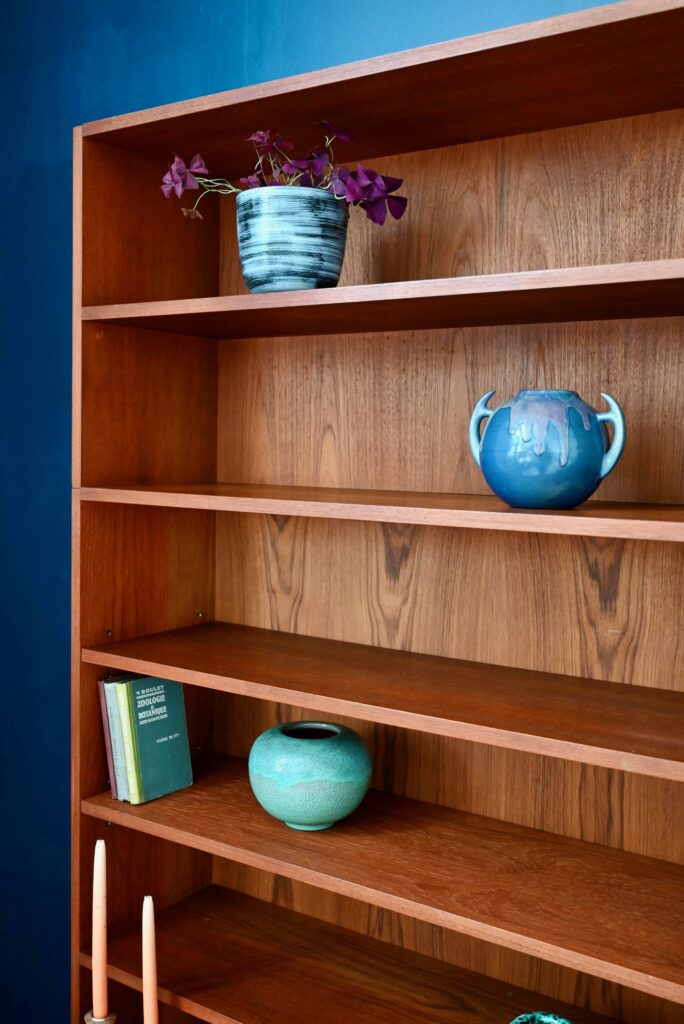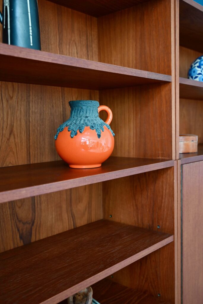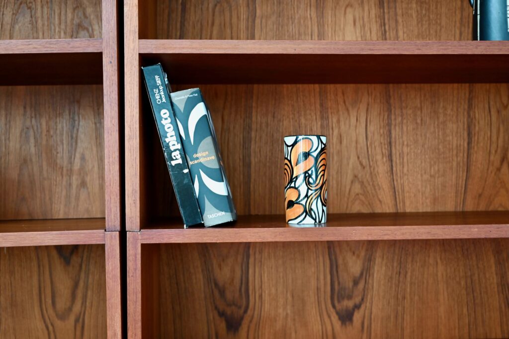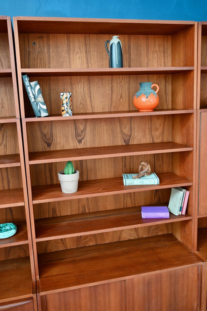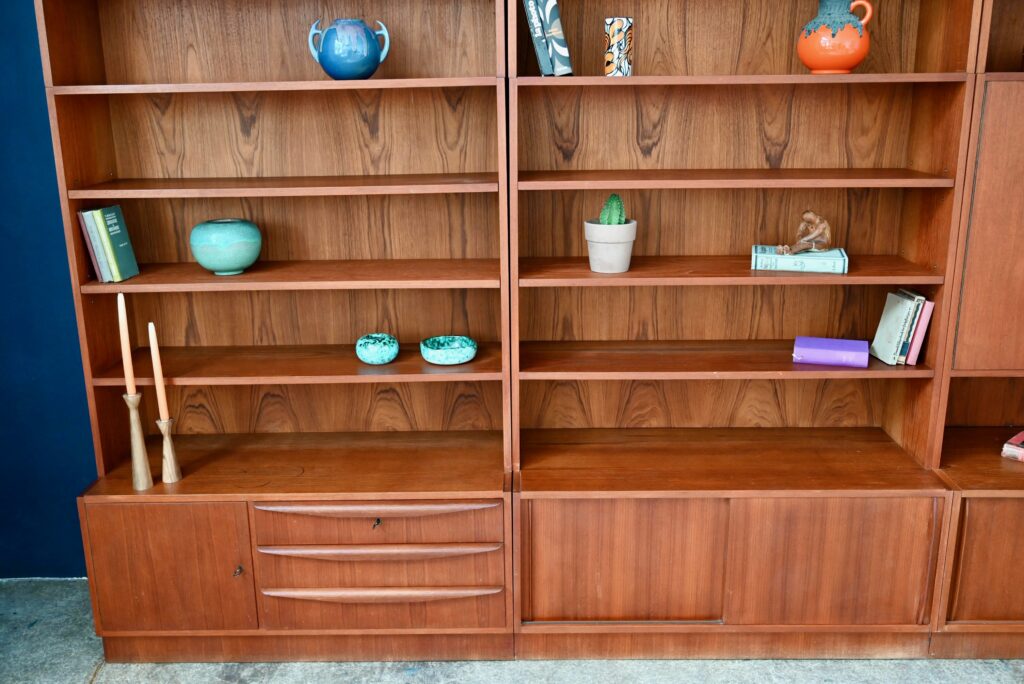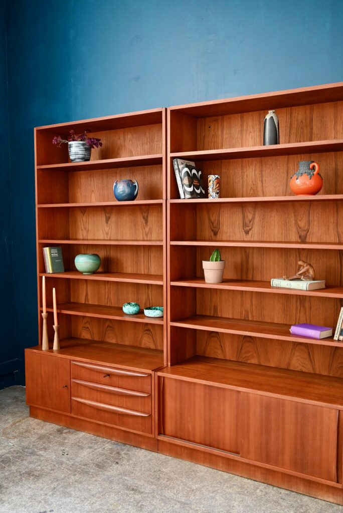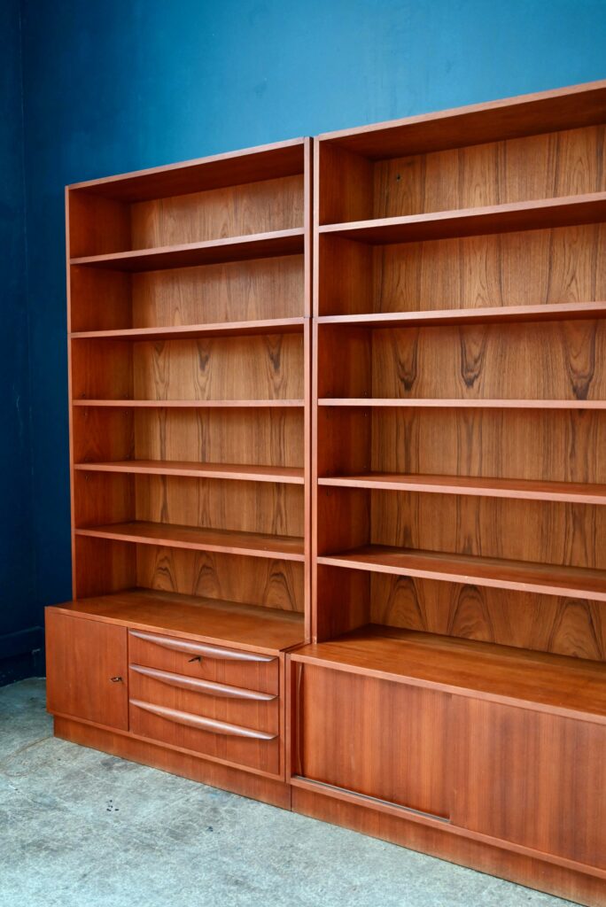 Ce grand ensemble de mobilier modulable est une production des années 60. Le designer Heinrich Riestenpatt propose une solution de rangement haut de gamme, fonctionnelle est adaptable à toutes les situations. Les éléments sont en teck et placage teck, Les 3 bibliothèques sont modulables : caisson, étagères et rehausse qui s’imbriquent parfaitement. Le caisson est plus profond et les étagères. L’ensemble dispose de tablettes, étagères, caissons de rangement, tiroirs, vaisselier fermé par des portes battantes Ce wall system élégant et de très belle qualité sera une bibliothèque idéal et meuble parfait pour présenter une déco choisie, meuble de salon pour la Hifi. L’ensemble est mis en valeur par la chaleur du teck au moyen de lignes évidentes et d’assemblages soignés.