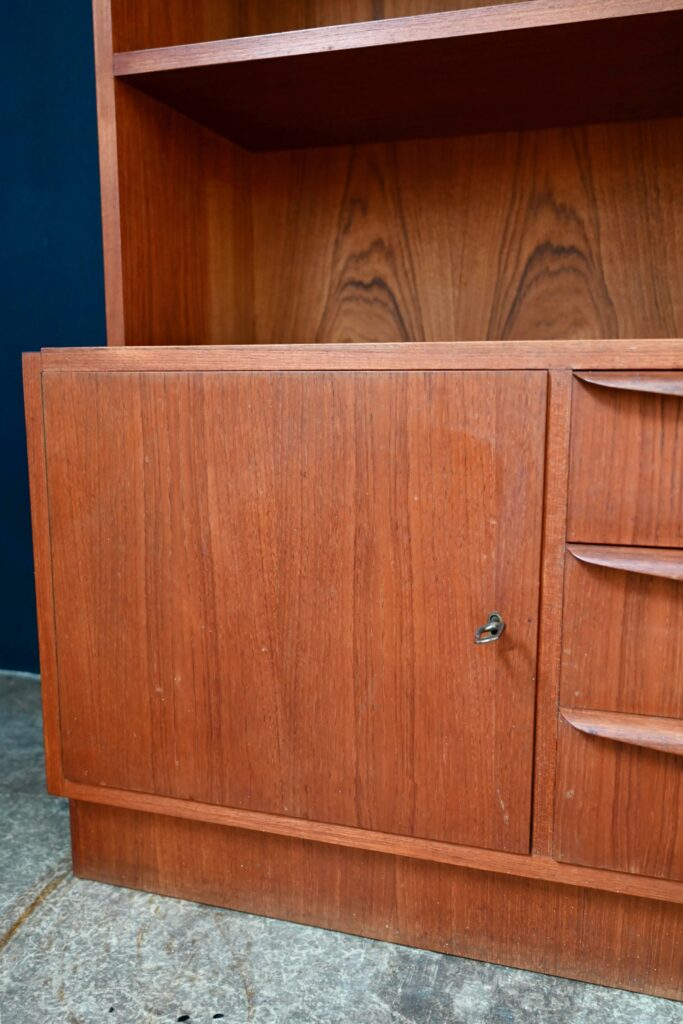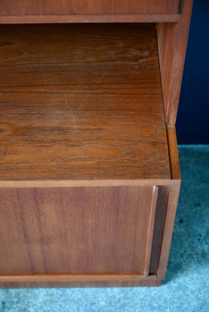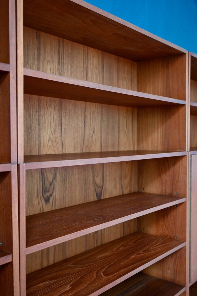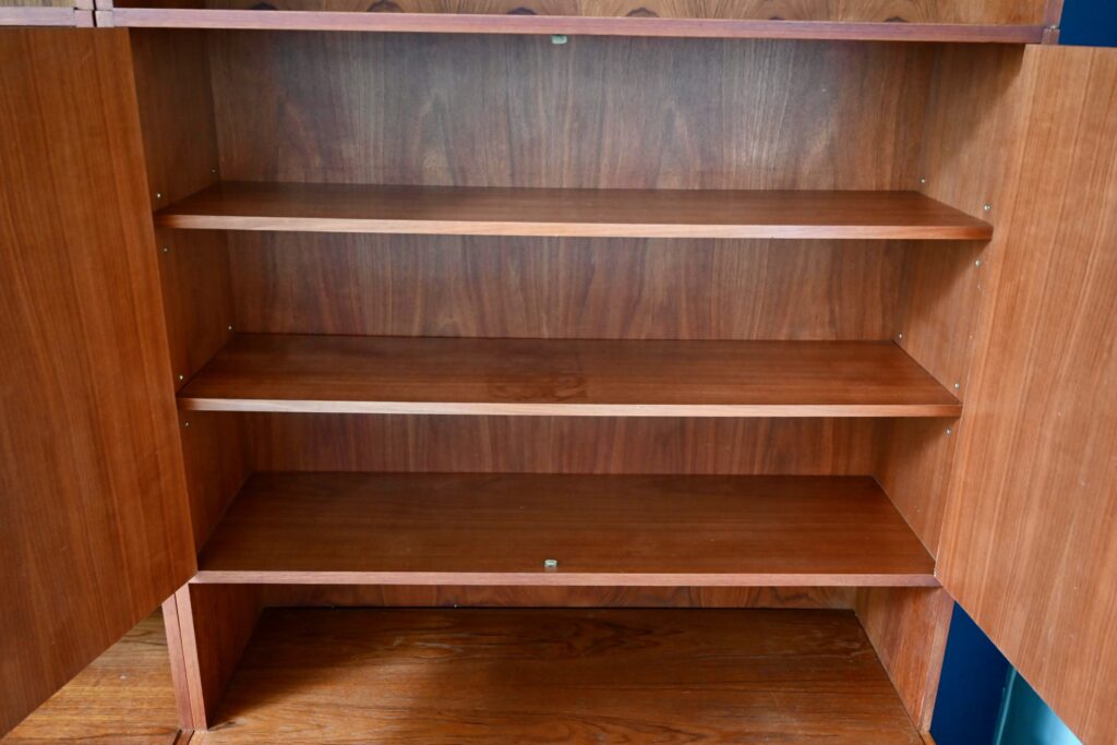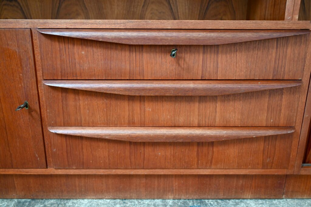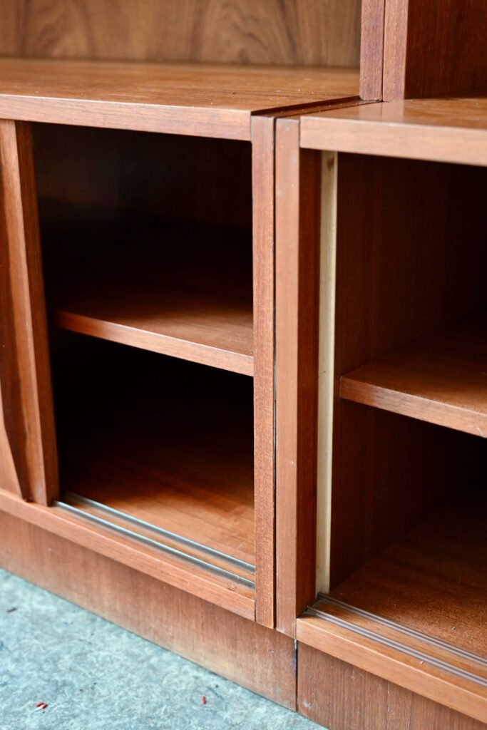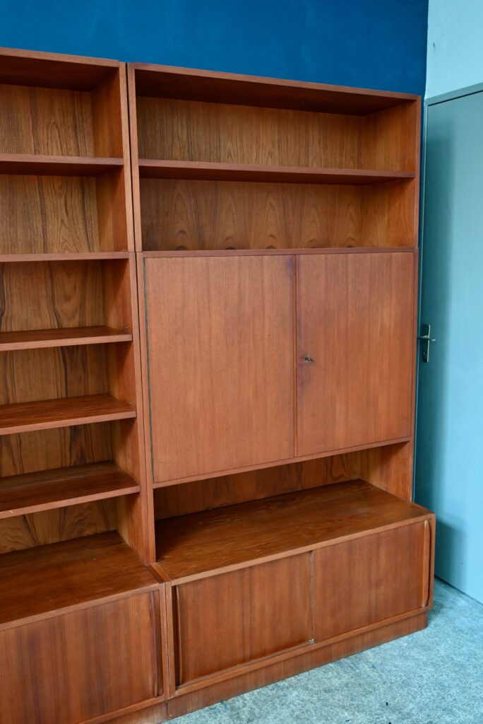 L’ensemble d’étagères est composé de 3 modules indépendants, chacun composé d’un caisson bas-caisson étagères- rehausse. Des traces d’usage sont visibles, légères, ainsi que quelques discrètes taches et décolorations, visibles en photo. Un trou discret dans la rehausse est visible sur une photo. Les portes coulissent parfaitement, les tiroirs, clef et serrures fonctionnent. Des traces sont visibles sur le plateau d’un des caisson. L’ensemble scandinave est ingénieux, sa modularité est parfaite. Ce mobilier haut de gamme bénéficie d’une réalisation soignée, durable et d’un teck de premier choix. Les étagères sont réglables en hauteur. L’ensemble est lourd et très stable. Un 4ème ensemble est disponible à l’atelier, une poignée d’une porte coulissante serait à refaire.