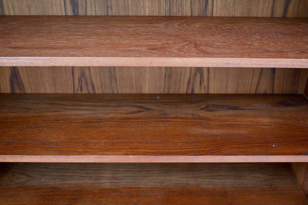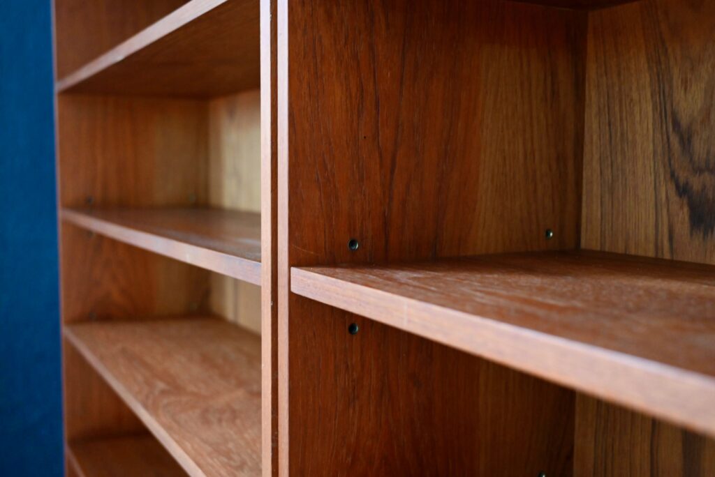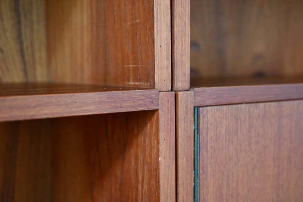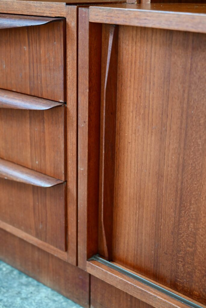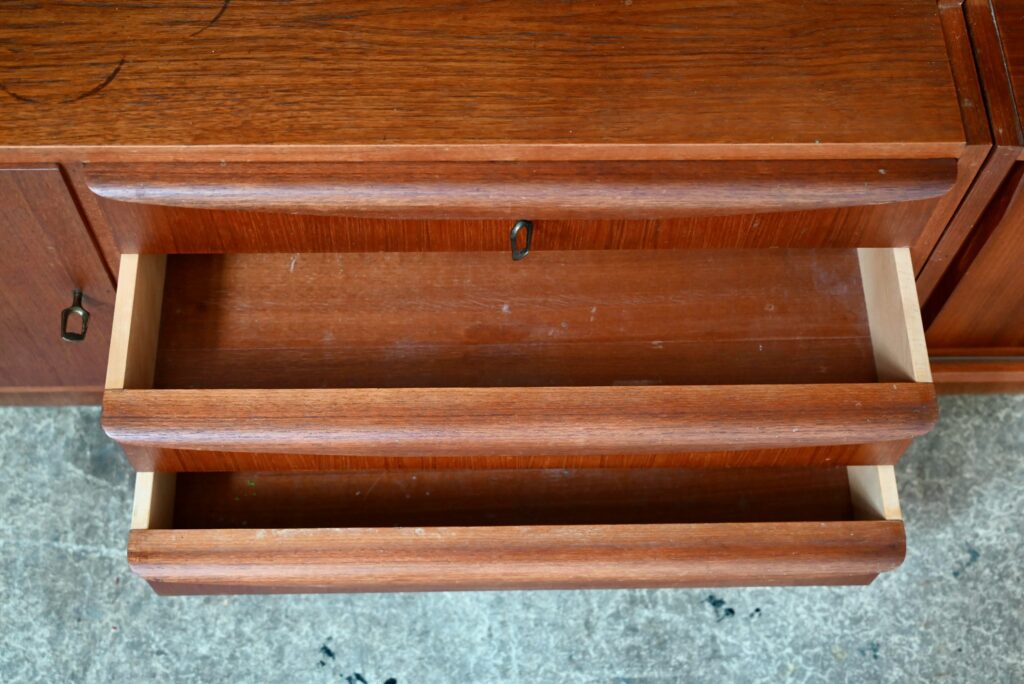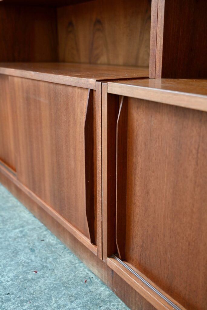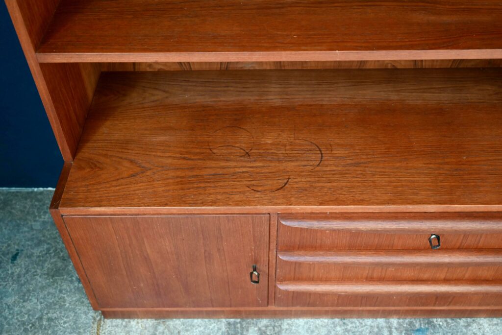 L’ensemble d’étagères est composé de 3 modules indépendants, chacun composé d’un caisson bas-caisson étagères- rehausse. Des traces d’usage sont visibles, légères, ainsi que quelques discrètes taches et décolorations, visibles en photo. Un trou discret dans la rehausse est visible sur une photo. Les portes coulissent parfaitement, les tiroirs, clef et serrures fonctionnent. Des traces sont visibles sur le plateau d’un des caisson. L’ensemble scandinave est ingénieux, sa modularité est parfaite. Ce mobilier haut de gamme bénéficie d’une réalisation soignée, durable et d’un teck de premier choix. Les étagères sont réglables en hauteur. L’ensemble est lourd et très stable. Un 4ème ensemble est disponible à l’atelier, une poignée d’une porte coulissante serait à refaire.