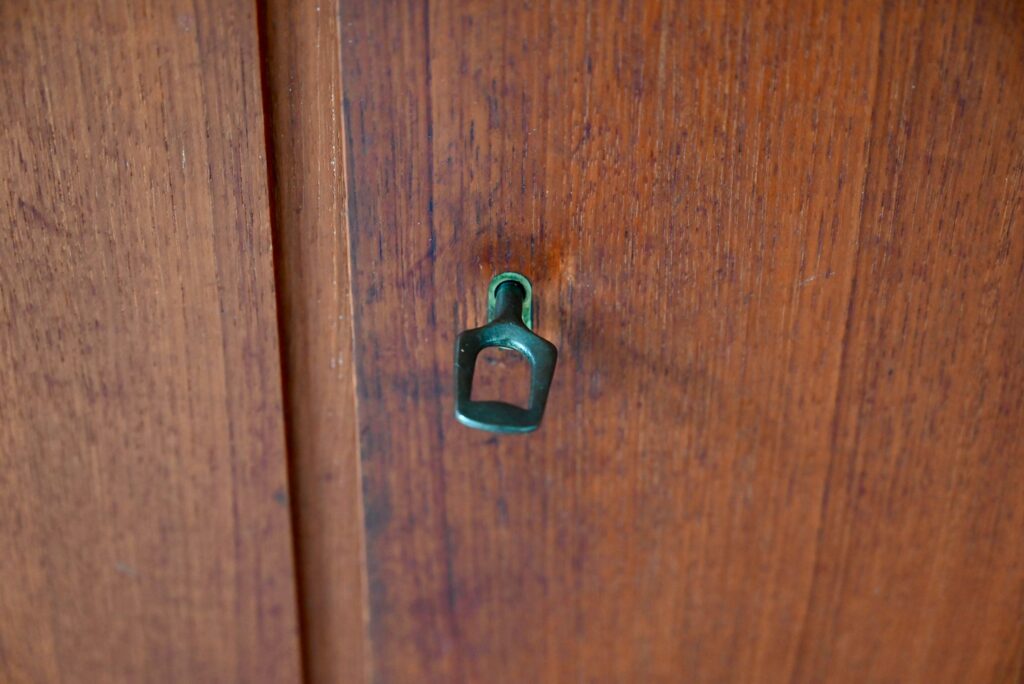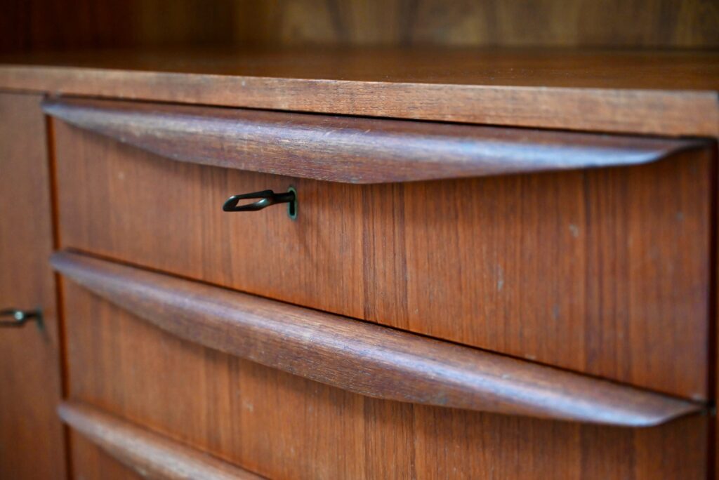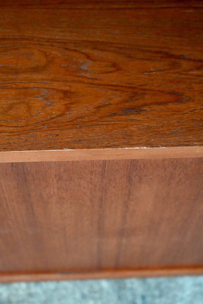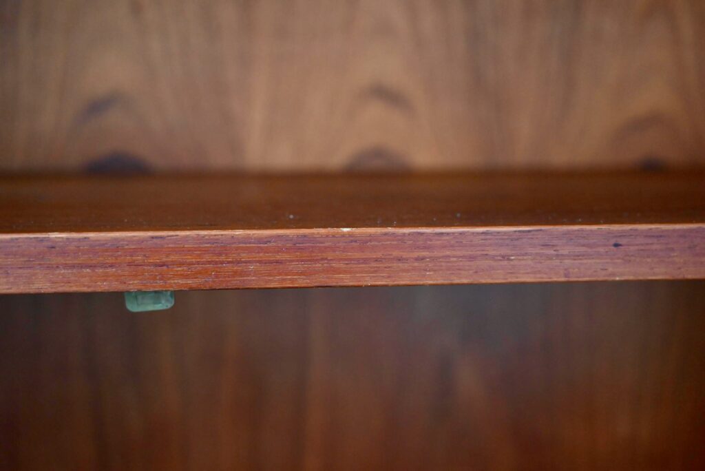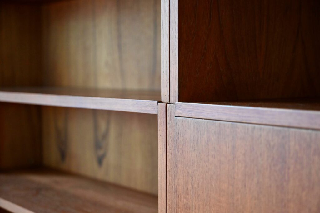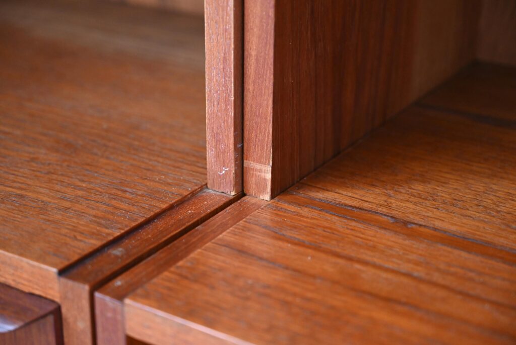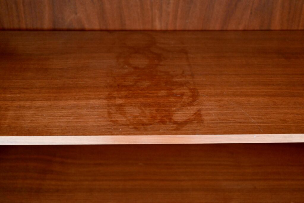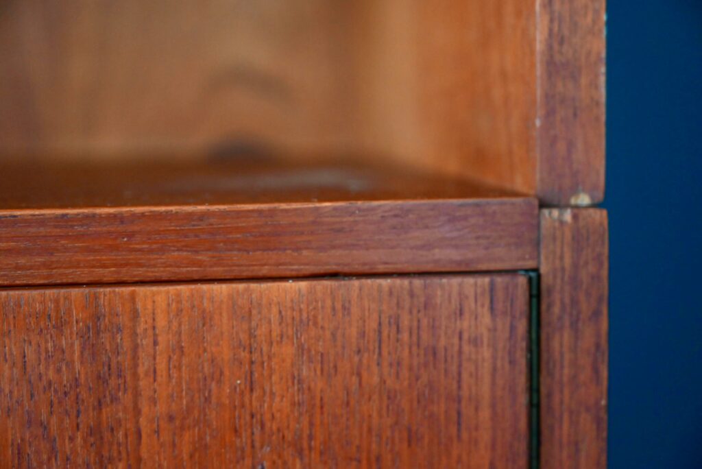 L’ensemble d’étagères est composé de 3 modules indépendants, chacun composé d’un caisson bas-caisson étagères- rehausse. Des traces d’usage sont visibles, légères, ainsi que quelques discrètes taches et décolorations, visibles en photo. Un trou discret dans la rehausse est visible sur une photo. Les portes coulissent parfaitement, les tiroirs, clef et serrures fonctionnent. Des traces sont visibles sur le plateau d’un des caisson. L’ensemble scandinave est ingénieux, sa modularité est parfaite. Ce mobilier haut de gamme bénéficie d’une réalisation soignée, durable et d’un teck de premier choix. Les étagères sont réglables en hauteur. L’ensemble est lourd et très stable. Un 4ème ensemble est disponible à l’atelier, une poignée d’une porte coulissante serait à refaire.