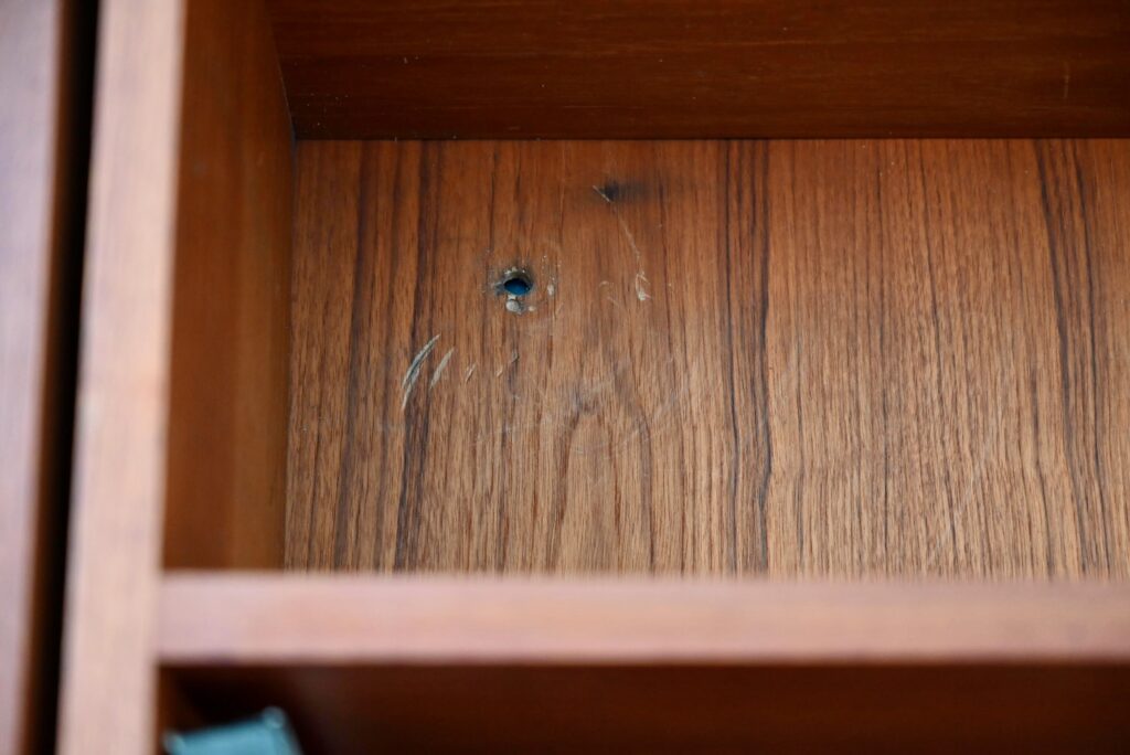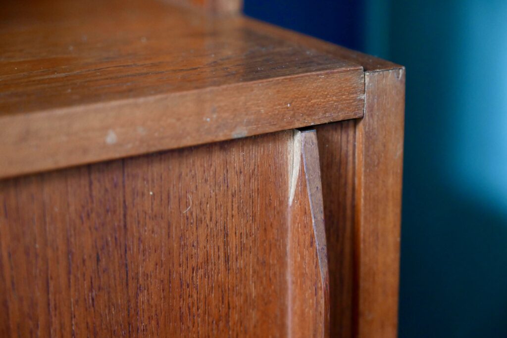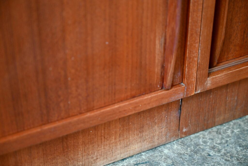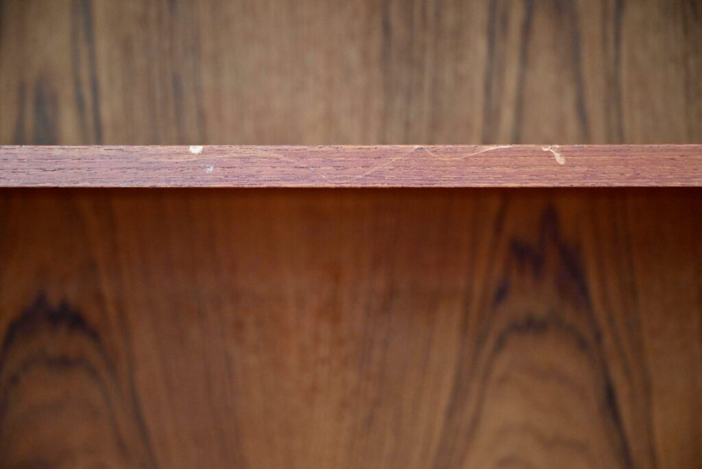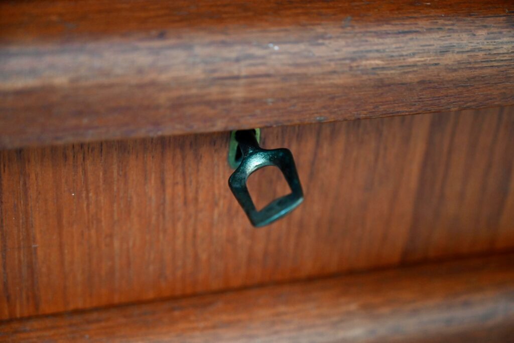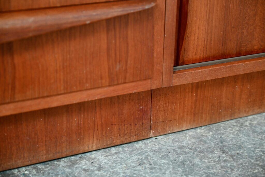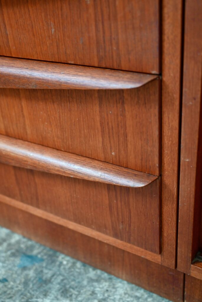 L’ensemble d’étagères est composé de 3 modules indépendants, chacun composé d’un caisson bas-caisson étagères- rehausse. Des traces d’usage sont visibles, légères, ainsi que quelques discrètes taches et décolorations, visibles en photo. Un trou discret dans la rehausse est visible sur une photo. Les portes coulissent parfaitement, les tiroirs, clef et serrures fonctionnent. Des traces sont visibles sur le plateau d’un des caisson. L’ensemble scandinave est ingénieux, sa modularité est parfaite. Ce mobilier haut de gamme bénéficie d’une réalisation soignée, durable et d’un teck de premier choix. Les étagères sont réglables en hauteur. L’ensemble est lourd et très stable. Un 4ème ensemble est disponible à l’atelier, une poignée d’une porte coulissante serait à refaire.