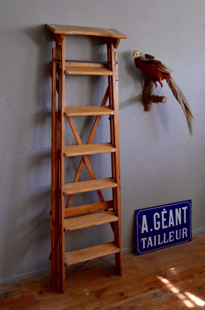 Le bois est sain, avec une belle patine d’usage, le bois usé par endroit. La structure et les marches de l’escabeau sont réalisées avec finesse. Une restauration a été effectuée par un propriétaire précédent. De par son âge, l’objet est plus destiné à la déco qu’à un usage intensif.