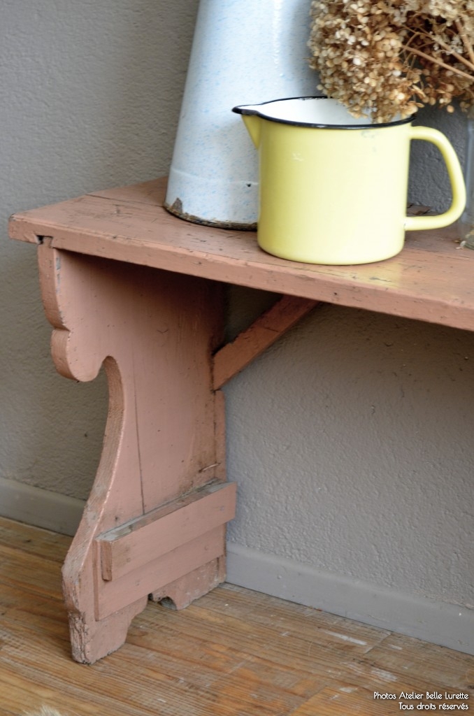 Cette étagère ou banc de pots rétro dévoile une patine somptueuse et de jolis dessins dans le piétement. Ancienne et faite de planches épaisses, ses lignes rustiques sont douces et s’intégreront parfaitement dans une cuisine aux accents bohème…