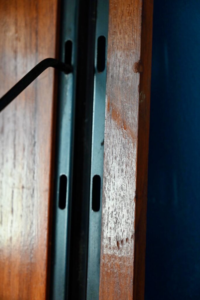 L’étagère est ancienne et date des années 60. Le fond est constitué d’un superbe panneau de bois à la teinte profonde et chaleureuse. Deux montants latéraux s’insèrent dans le panneau et permettent la fixation murale, ainsi que l’accroche des tablettes-étagères. Celles-ci comportent chacune deux montants en métal permettant la fixation dans les rails muraux. L’ensemble est de très belle qualité. La teinte du bois est superbe et, sur un mur, mettra en valeur les pièces décoratives ou livres qu’on présentera sur le meuble. Des zones légèrement décolorées par la lumière sur le panneau sont visibles en photo, ainsi que quelques traces d’usage et des traces d’oxydation sur les rails. L’ensemble est de très belle facture et très décoratif.