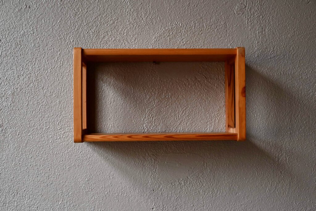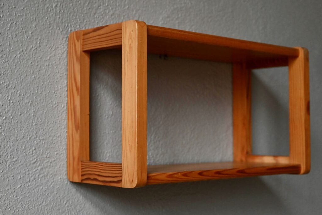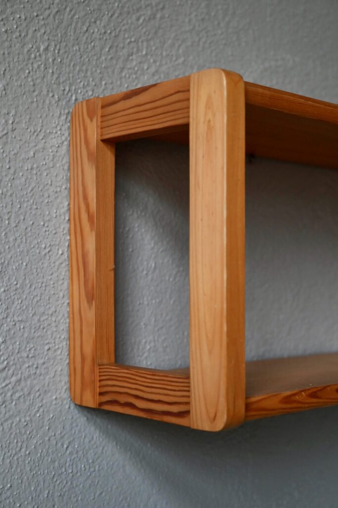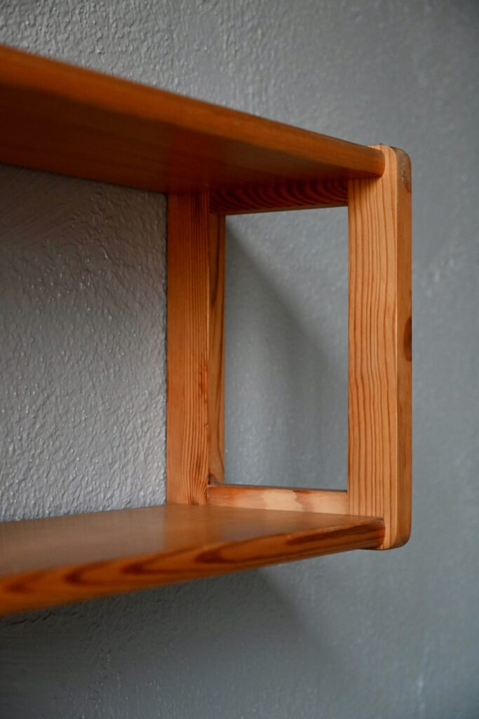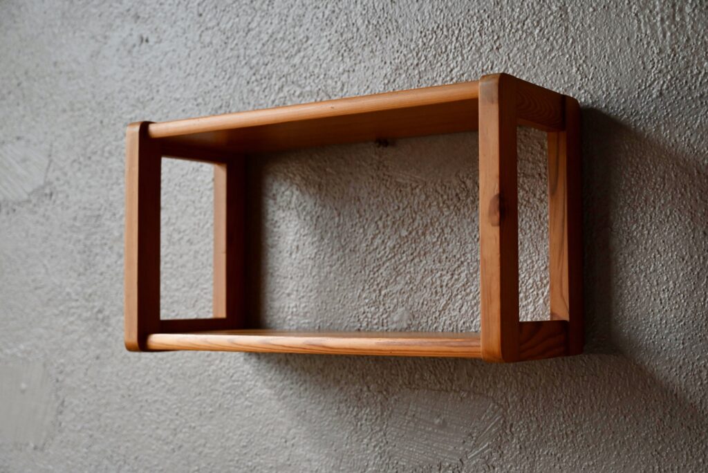 L’étagère est ancienne et date des années 70. Elle est en pin massif d’une teinte blonde. Elle se fixe aux murs et constitue une sorte de caisson bibliothèque ajouré sur les côtés. Deux points de fixation sont présents à l’arrière. Des traces d’usage discrètes sont présentes. L’ensemble est en bel état, épais et costaud.