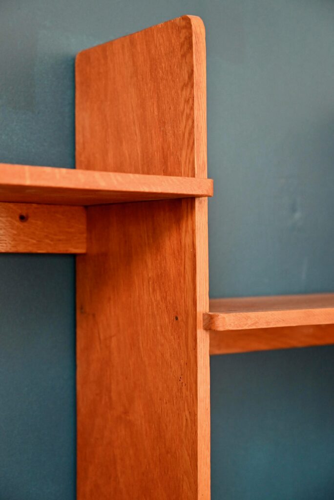 L’étagère est à poser directement sur le sol et à fixer sur le mur. Son design vintage et aérien est particulièrement agréable et fonctionnel. Le meuble est une production artisanale midcentury intéressante et originale. Quelques traces d’usage et rayures sont visibles. L’étagère est en contreplaqué, complétée par d’épais chants en bois massif.
