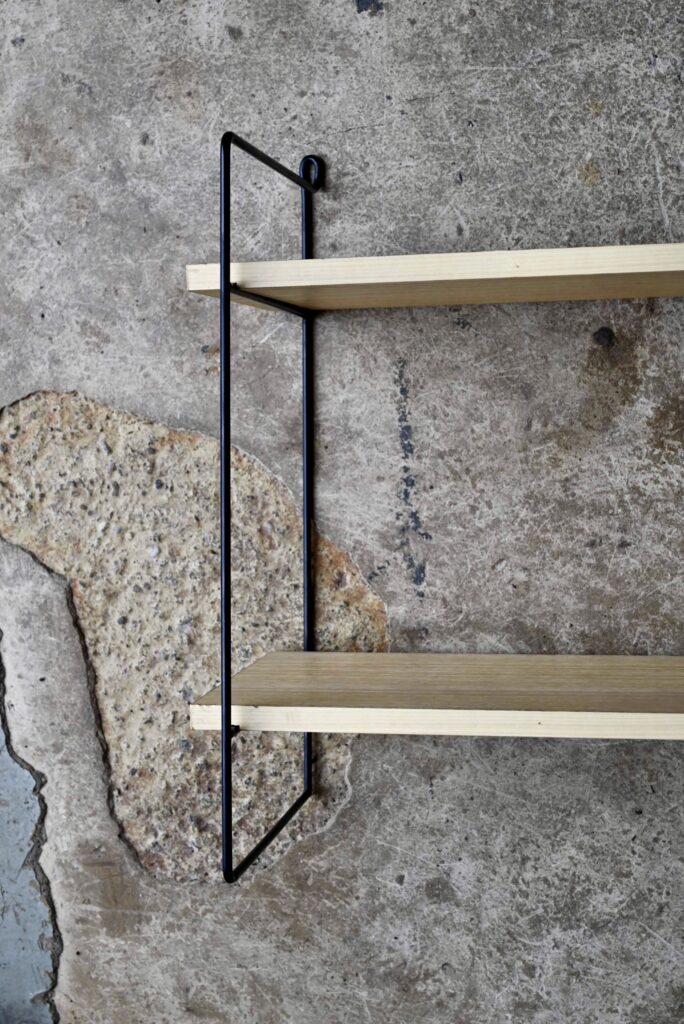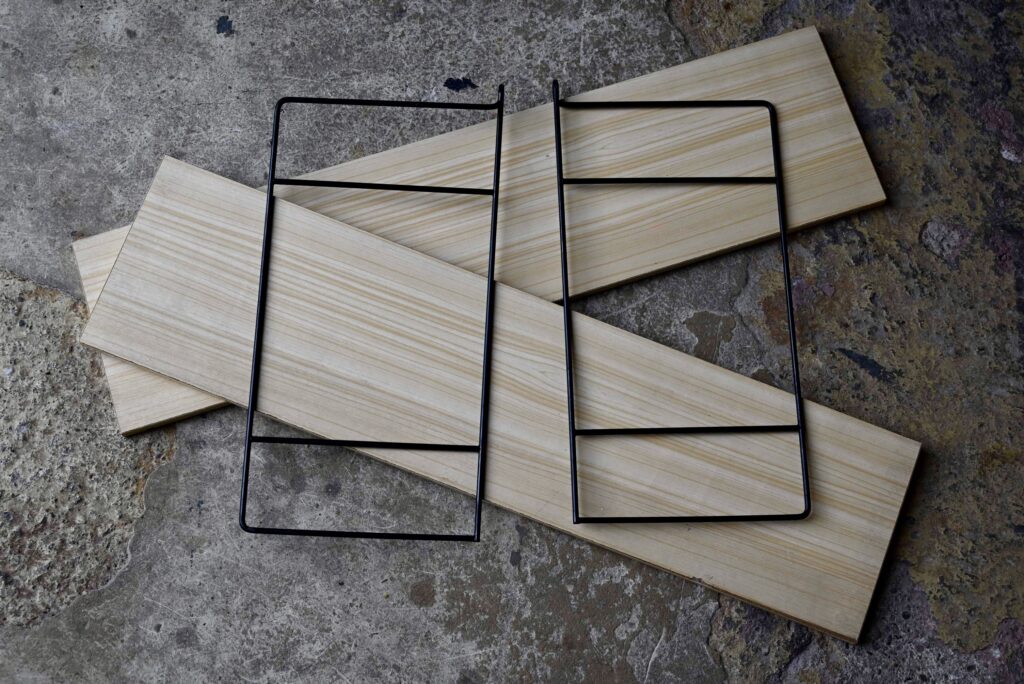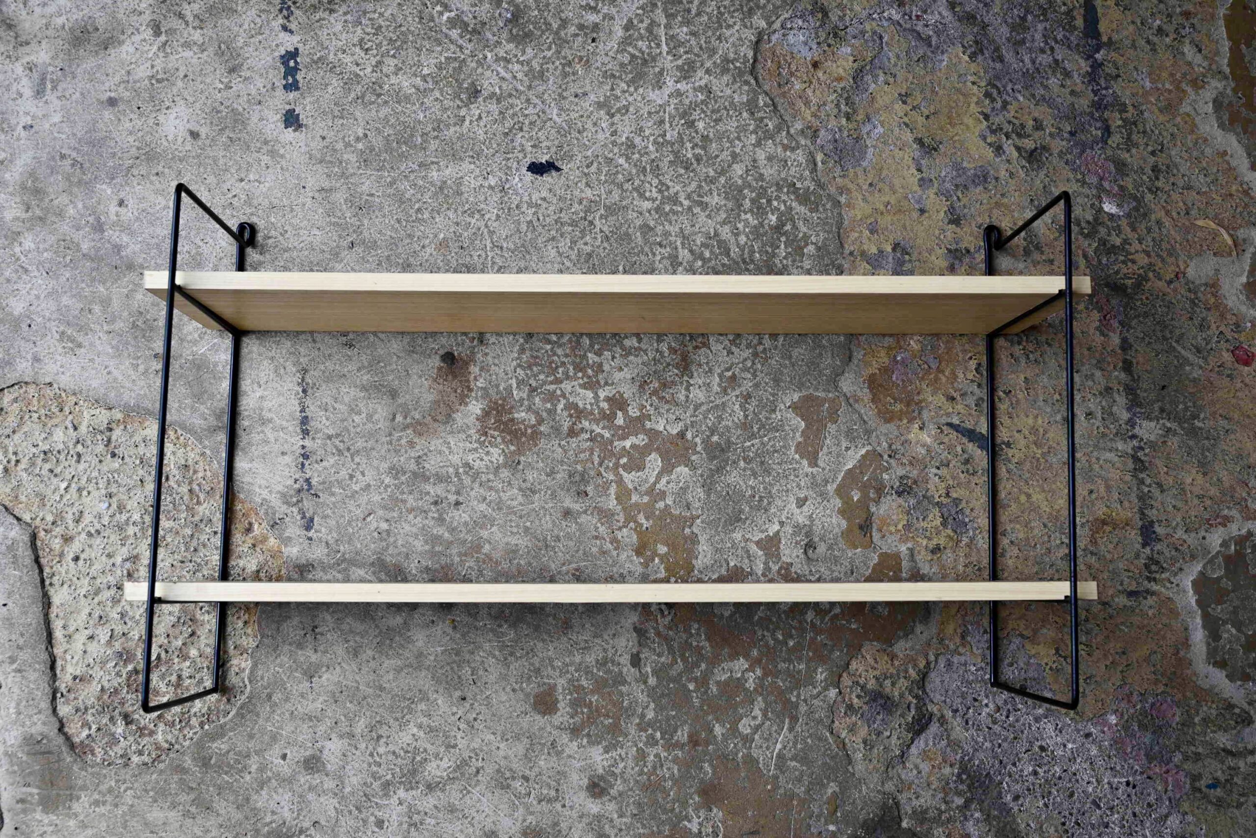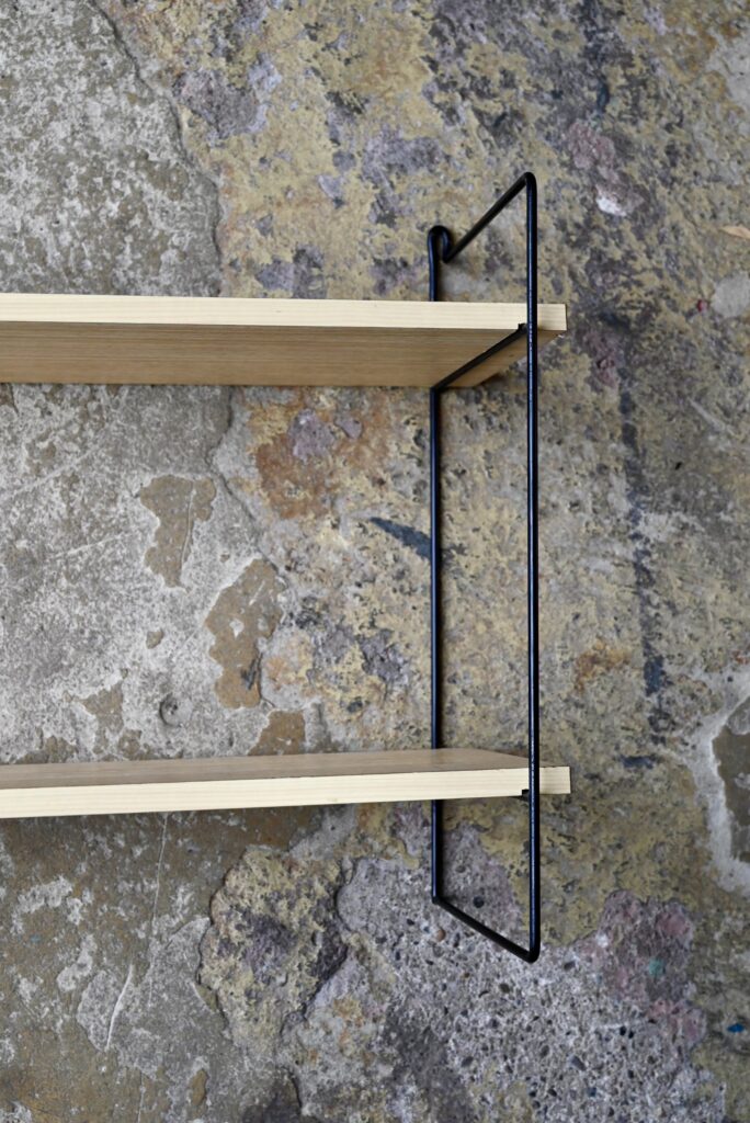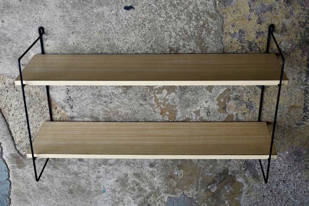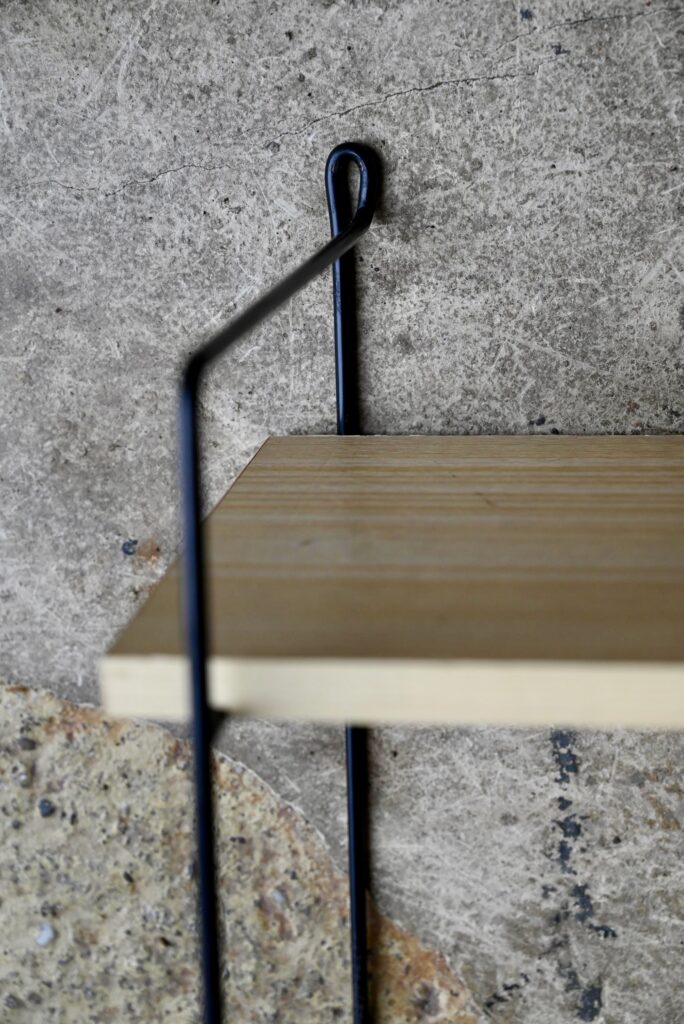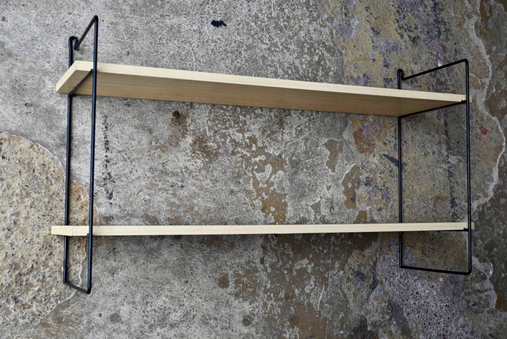 L’étagère string est à fixer au mur. Son design vintage et aérien est particulièrement agréable et fonctionnel. Les montants sont laqués de noir, quelques manques de peinture sont à noter. Les étagères sont en aggloméré, couvert d’un vinyle imitation bois clair/blanc. Traces de frottement sur les tranches des plateaux.