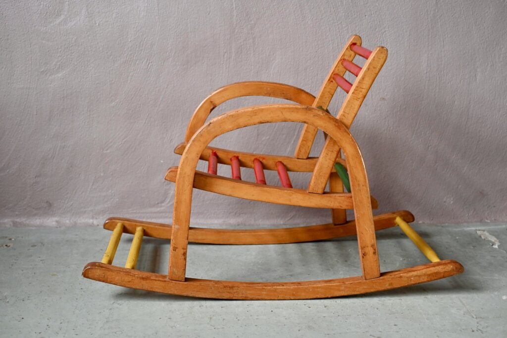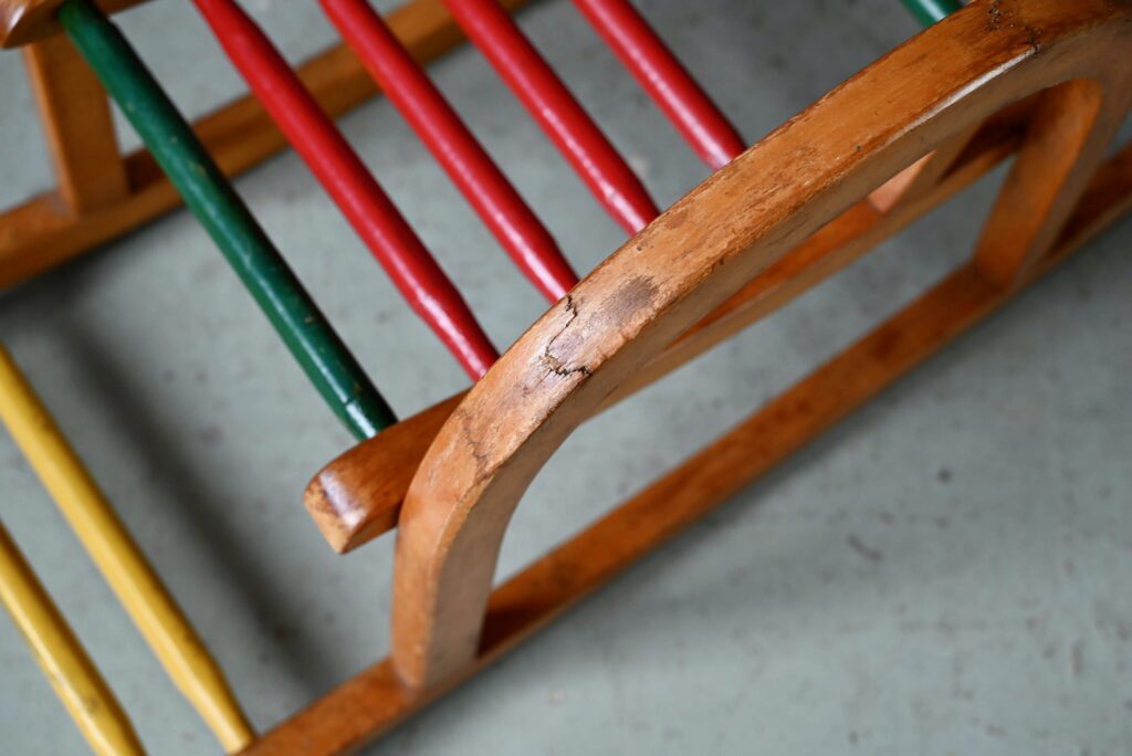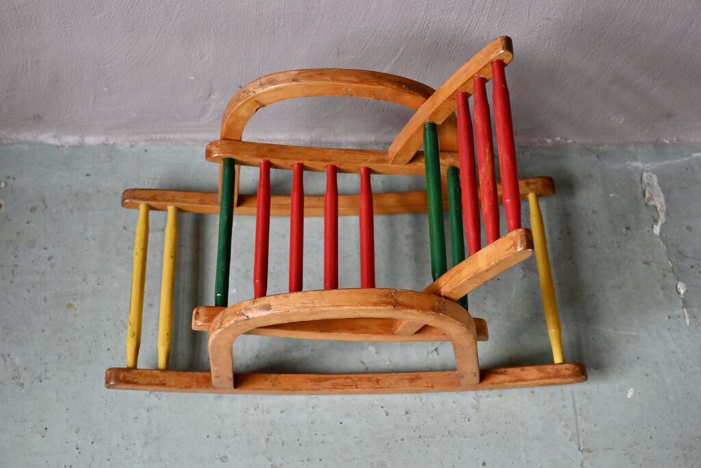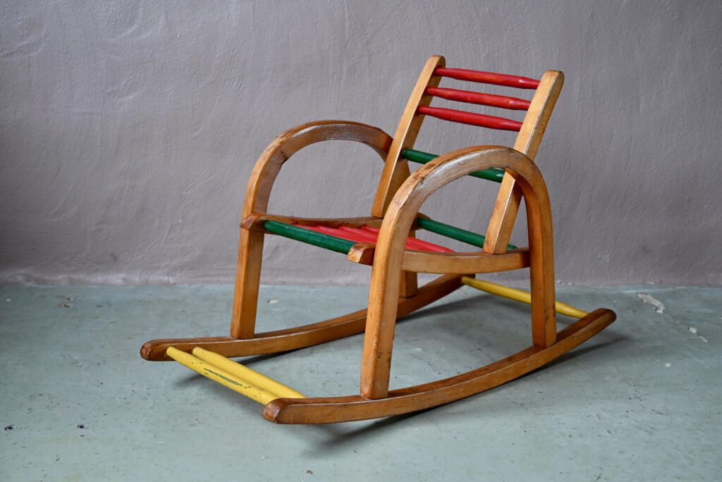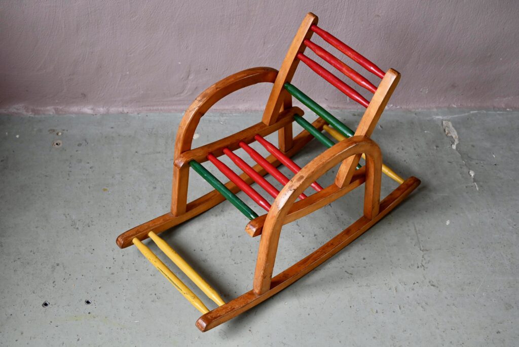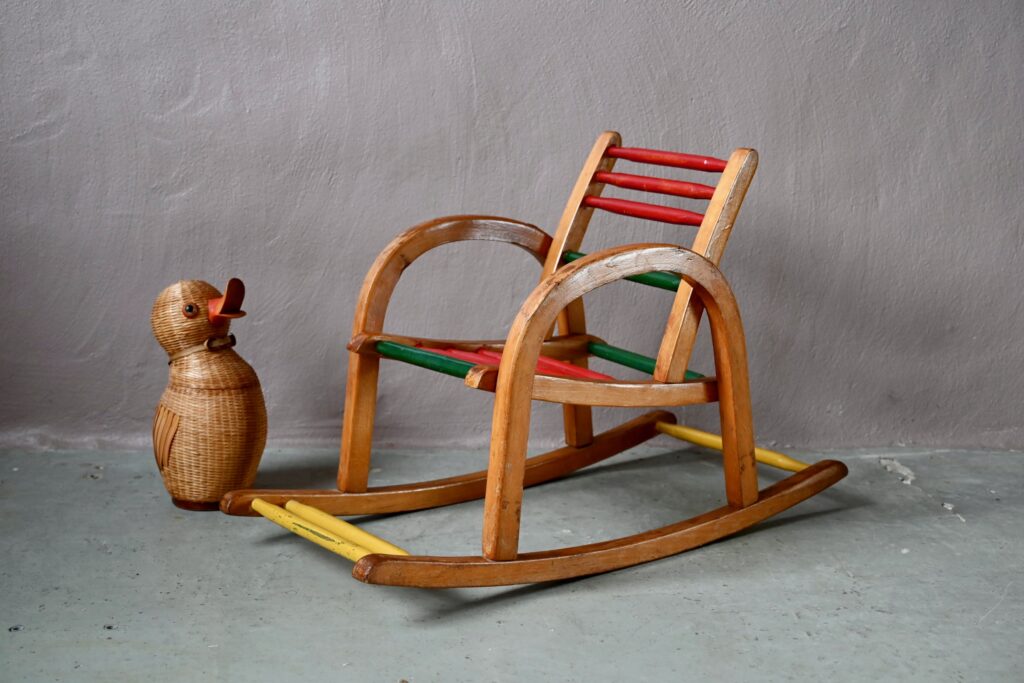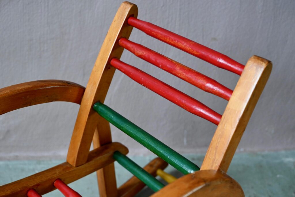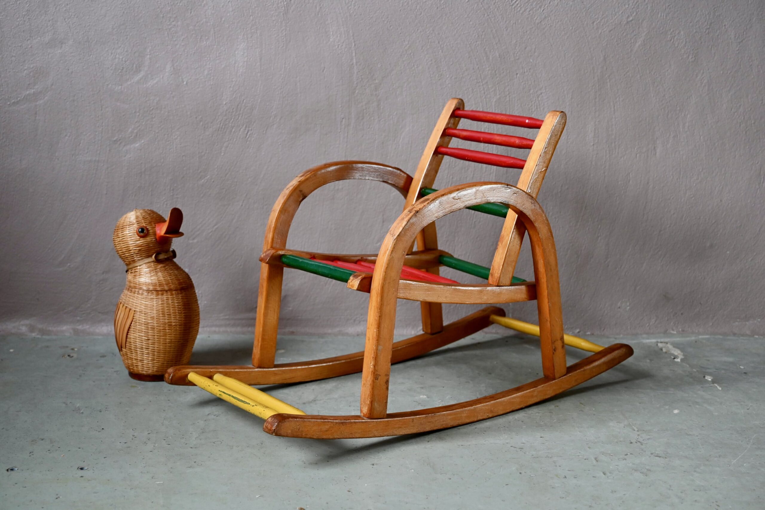 La chaise à bascule enfant est en hêtre massif. Certaines pièces sont en bois courbé. Les barreaux sont peints en rouge, vert et jaune, ce qui contraste joliment avec le bois. Le fauteuil date des années 50, sa structure est en bon état. Il est stable. Le bois est sain. Il présente une belle patine d’usage.