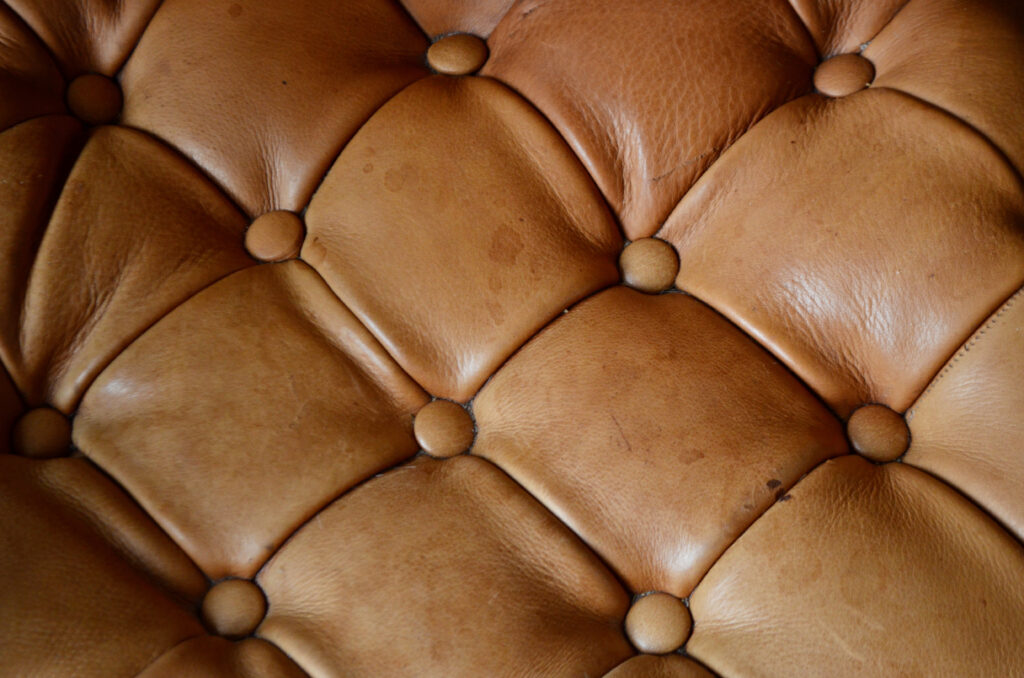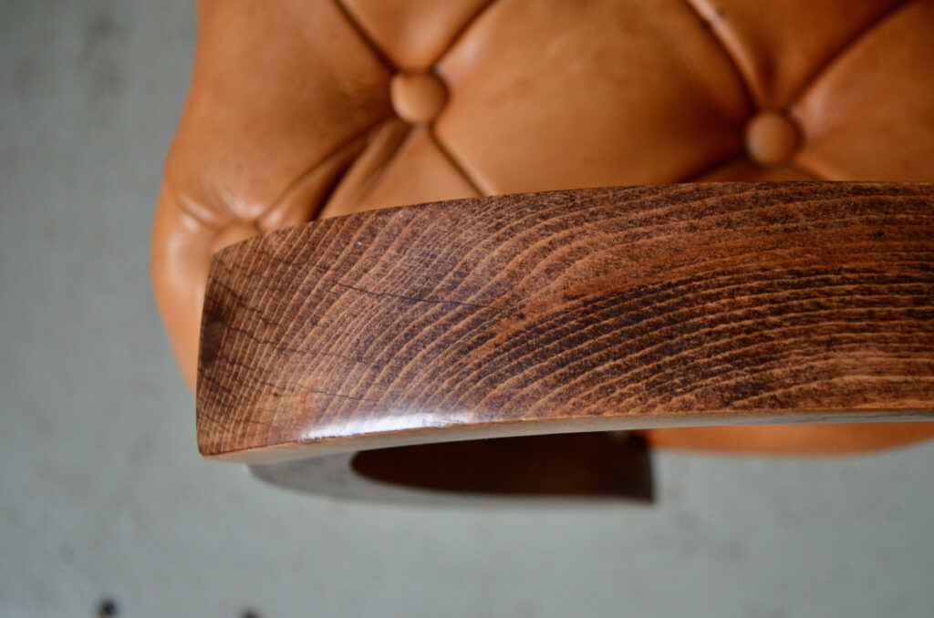 La structure du fauteuil ancien est en bois massif courbé. Le garnissage est en cuir havane, capitonné façon “Chesterfield”. L’ensemble est en bel état, quelques traces de frottement sont visibles sur le bois ainsi que sur la partie avant de l’assise. Cuir et bois ont été cirés et protégés.