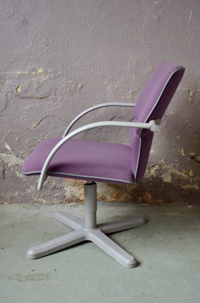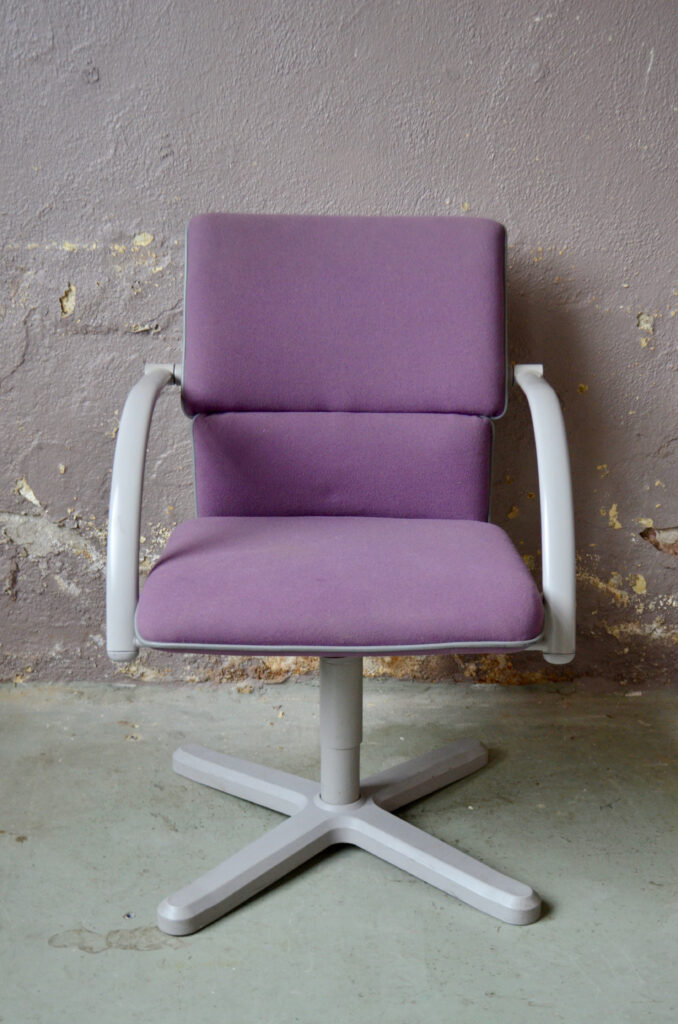 Ce fauteuil de bureau violet est une production du fabricant Suisse Stoll Giroflex qui réunit de nombreux atouts : confort, praticité, ergonomie et design vintage. Doté d’un pied étoile pivotant et de larges accoudoirs, l’ergonomie de ce fauteuil de bureau est étudiée pour en faire le parfait compagnon de travail! Il est couvert d’un tissu violet dans l’air du temps.