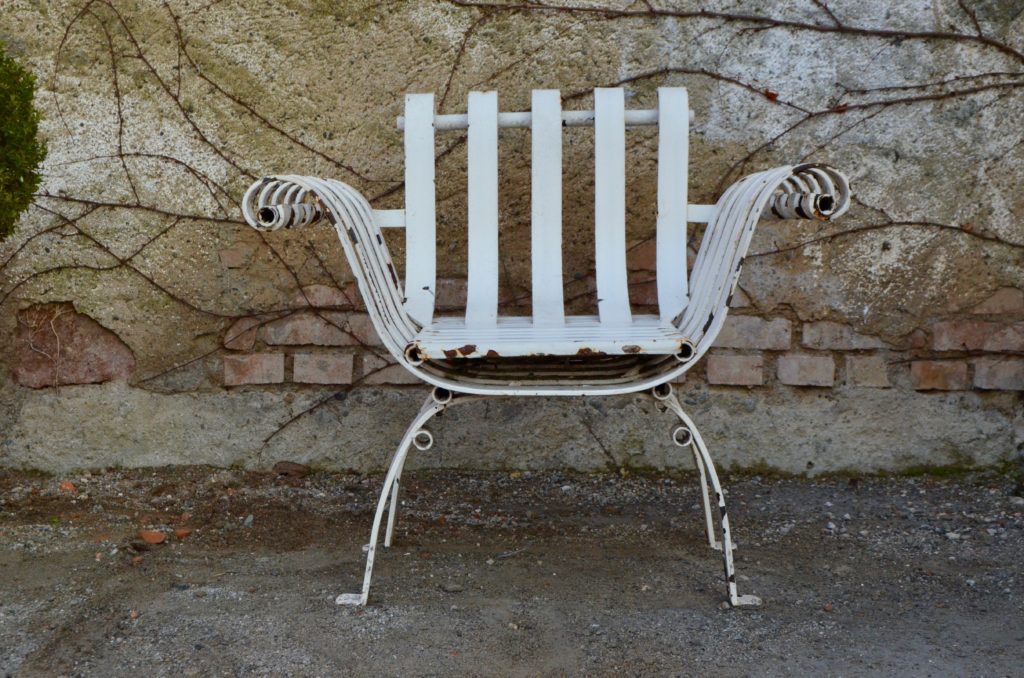 Les fauteuils sont larges, constitués d’épaisses lames de fer forgé courbées. Lourd, de facture exceptionnelle, ce mobilier d’extérieur est aussi rare que décoratif. La peinture blanche est écaillée et patinée. Le prix affiché est pour une paire fauteuil.