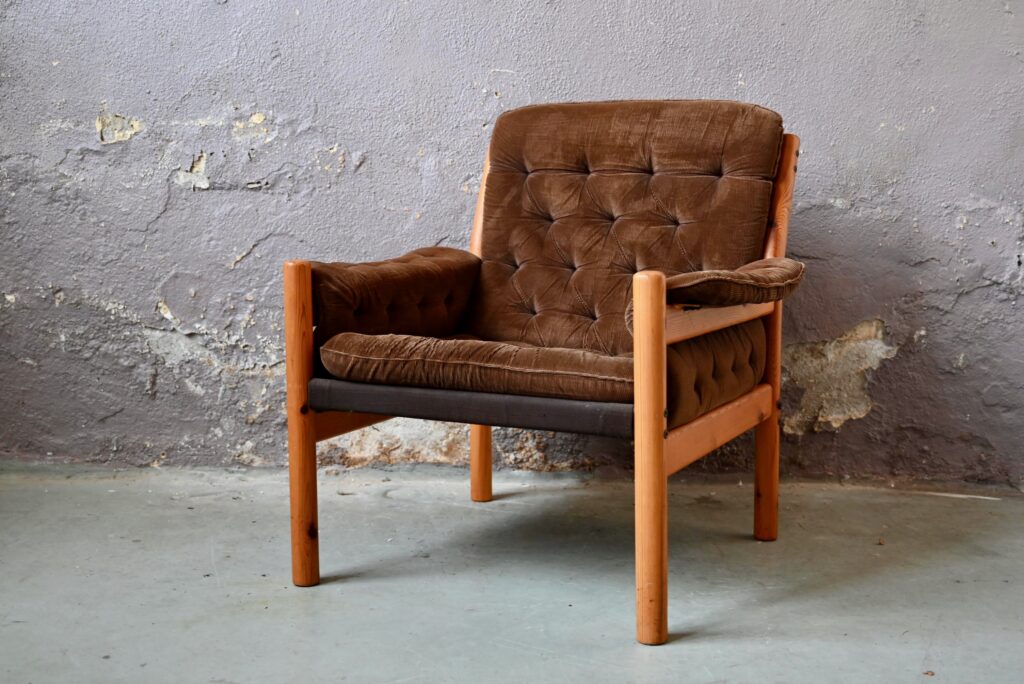 Le fauteuil est ancien et date des années 70. Il est en bel état. Il en pin massif et coussins en velours marron glacé. La structure en pin est minimaliste et élégante. Les coussins sont moelleux, non taché et sans odeur. Le velours est doux et lumineux, relevé par des boutons façon capitons.