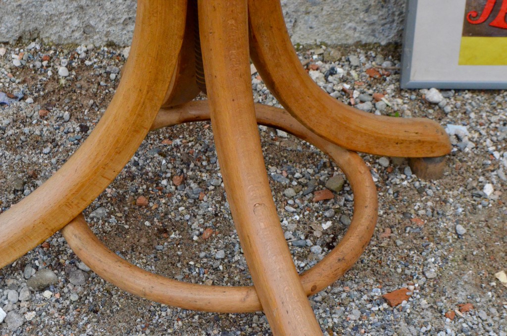 Le fauteuil est en bois massif courbé d’une belle teinte miel doré. Il est pivotant et réglable en hauteur grâce à une vis métallique. L’assise est cannée. L’ensemble est en bon état, stable et fonctionnel avec une belle patine. Le cannage est tendu en bon état.