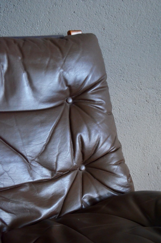 La paire de fauteuils Siesta est en bel état. Quelques traces d’usage sont visibles sur le cuir, particulièrement au niveau des coutures. La structure en bois est parfaite. Le dossier et l’assise sont posés sur une toile tendue par des cordelettes. Les coussins sont ultra-moelleux, ils participent à la souplesse de l’assise conférée par la structure en plywood. Le fauteuil Siesta est édité par la firme norvégienne Wesnofa. Le tarif indiqué est pour la paire.