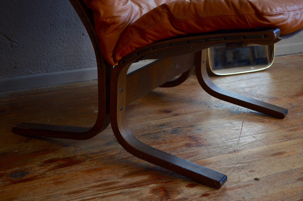 Le fauteuil est en bel état, quelques traces d’usage sont visibles sur le cuir. Le dossier et l’assise sont posés sur une toile tendue par des cordelettes. Ce modèle dispose d’un appui-tête, les coussins sont déhoussables. Ultra-moelleux, ils participent à la souplesse de l’assise conférée par la structure en plywood. Le fauteuil Siesta est édité par la firme norvégienne Wesnofa. Nous disposons d’un exemplaire sans accoudoir et d’un fauteuil avec accoudoirs.