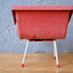 Le fauteuil date des années 50, il est réalisé en métal et recouvert de feutrine rouge légèrement délavé. Des traces du temps importantes sont visibles.