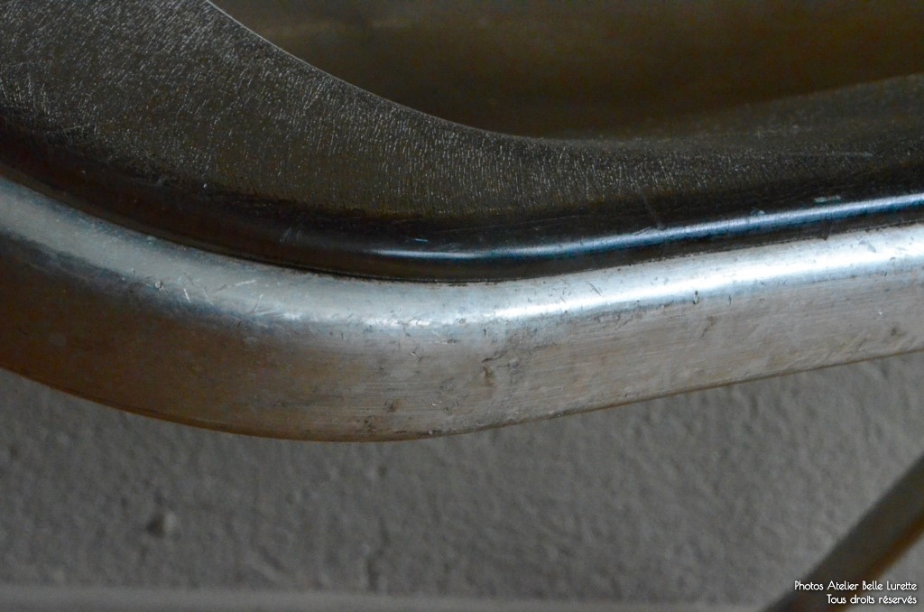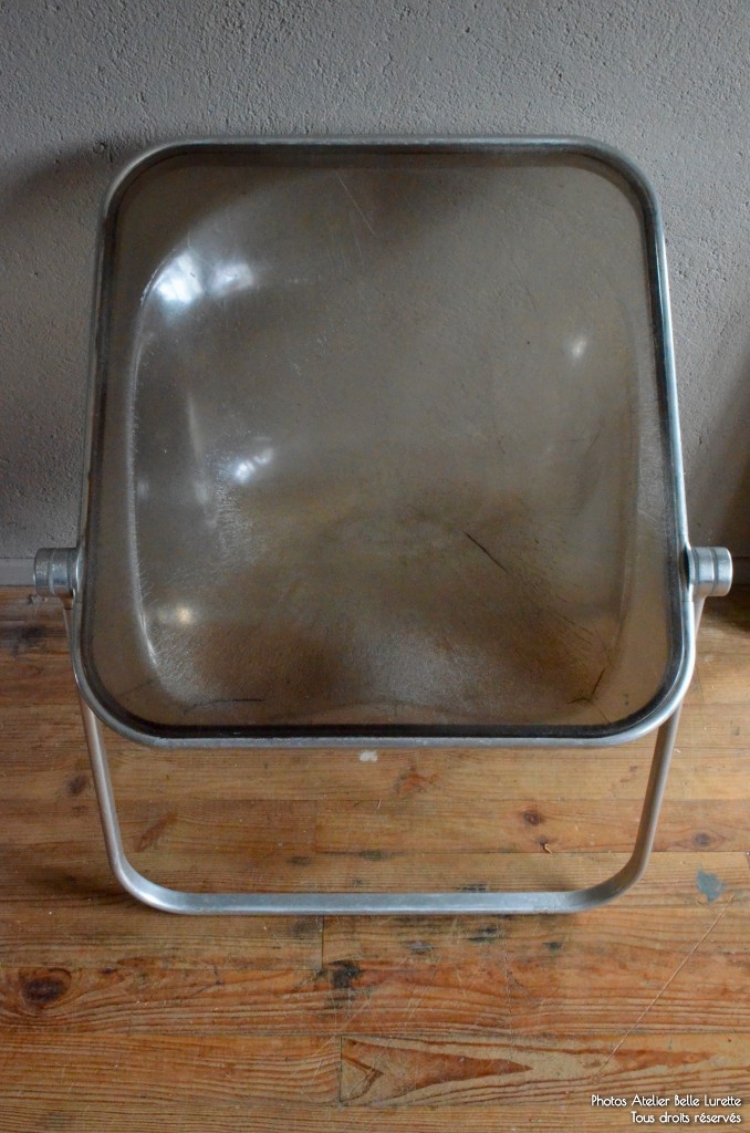 Cette chaise pliante est en Perspex, matériau proche du plexiglas, et en métal chromé. Elle date des années 1970. Le fauteuil a connu une utilisation intense, nombreuses marques d’usage. L’assise possède de nombreuses irisations ainsi que deux lézardes. Le fauteuil est pliable.