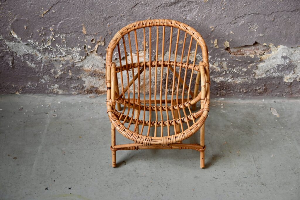 Lignes tendres et bohèmes pour ce fauteuil enfant des années 70! En rotin clair, il est lumineux et plein de charme. Son assise est large et confortable, son piétement est stable et solide. Léger, il sera un parfait « premier » fauteuil pour le tout-petit.