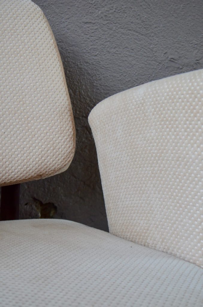 Ce modèle de fauteuil bas, dit également chauffeuse, a été dessiné par Günter Eberle et fabriqué par Thonet dans les années 60. Témoin d’une époque ou le confort rimait avec inventivité formelle, ces fauteuils proposent un design minimaliste épuré, mettant en avant matériaux de qualité et formes simples. Mobilier haut de gamme, produit en petite série, cette version est dotée d’accoudoirs et d’un velours texturé blanc perle.