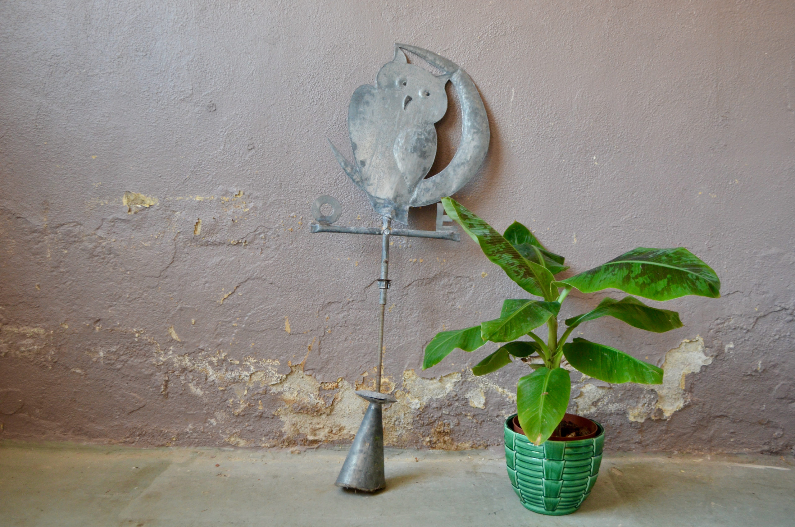 Posée sur la Lune, une chouette semble nous indiquer le chemin à suivre, comme dans un conte de Tomy Ungerer… Cette superbe girouette a retrouvé le plancher des vaches il y a peu, et nous réjouit! L’oxydation du zinc vient souligner les détails de cette girouette rétro et renforcer son caractère authentique. Objet déco ou de collection, sur le toit ou au fond du jardin, cette girouette, oeuvre d’un artisan-poète, fera tourner les têtes!