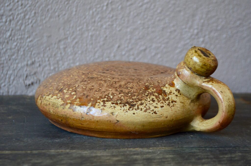 La céramique est une bouteille ou flasque à la forme aplatie appelée gourde crapaud. Objet usuel campagnard, emplie d’eau ou de vin, elle accompagnait les paysans lors des travaux aux chants. Sa forme permettait de la poser au sol afin de conserver un peu de fraicheur. La gourde est réalisée en grès tourné, c’est un objet vernaculaire qui deviendra une pièce décorative originale.