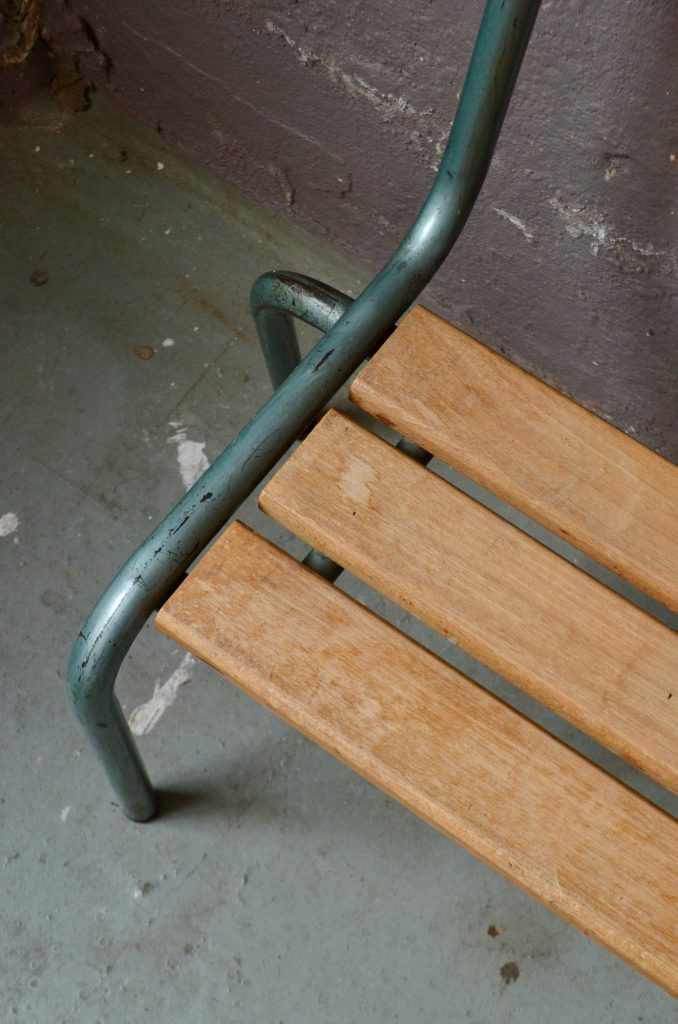 Le banc est ancien et date des années 60. Le piétement tubulaire est en métal patiné, teinte bleu-gris. L’assise et le dossier sont constitués de lattes de bois massif. Le lustre est très beau. Des marques d’usage sont présentes. L’ensemble est stable et solide, en bel état.